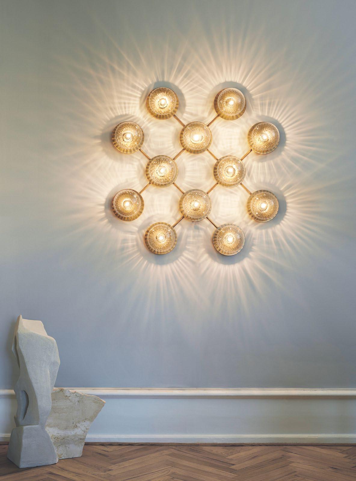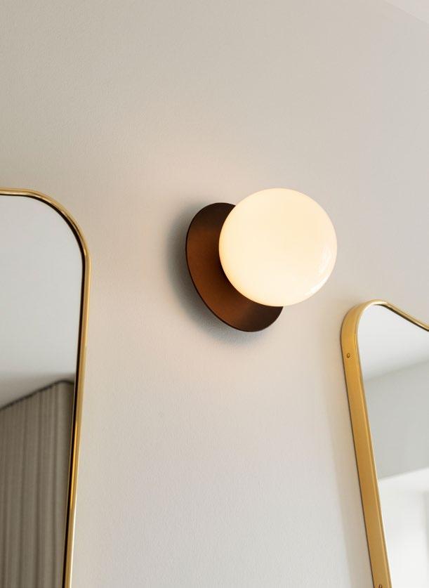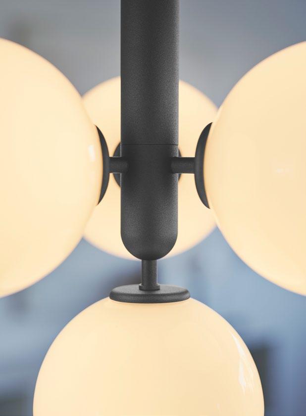 The Liila collection is created around the modular wall chandelier, Liila 12. The idea behind the collection is to create wall and ceiling lighting,withglassasthefocalpoint.Themouth-blownglassglobesare mounted on metal discs, giving the glass a floating appearance and creating lighting with references to the summer sun. From the collection’s centrepiece, the series unfolds into smaller wall chandeliers and single lamps for the wall and ceiling.