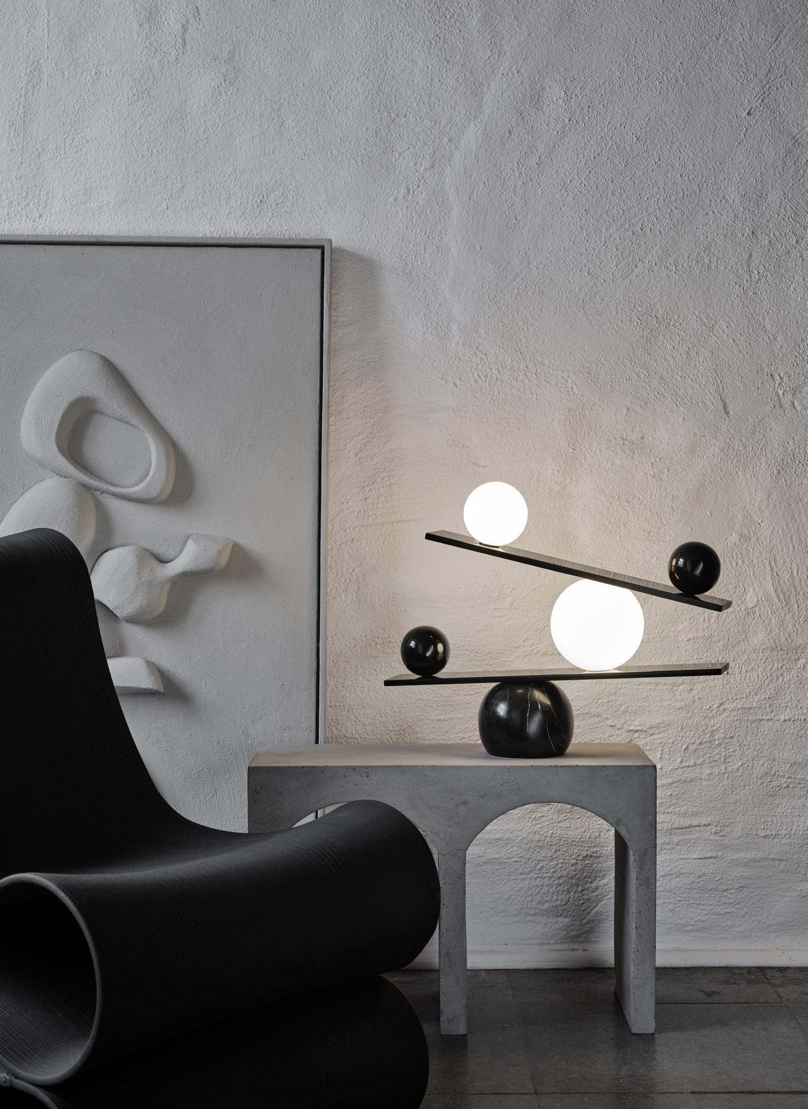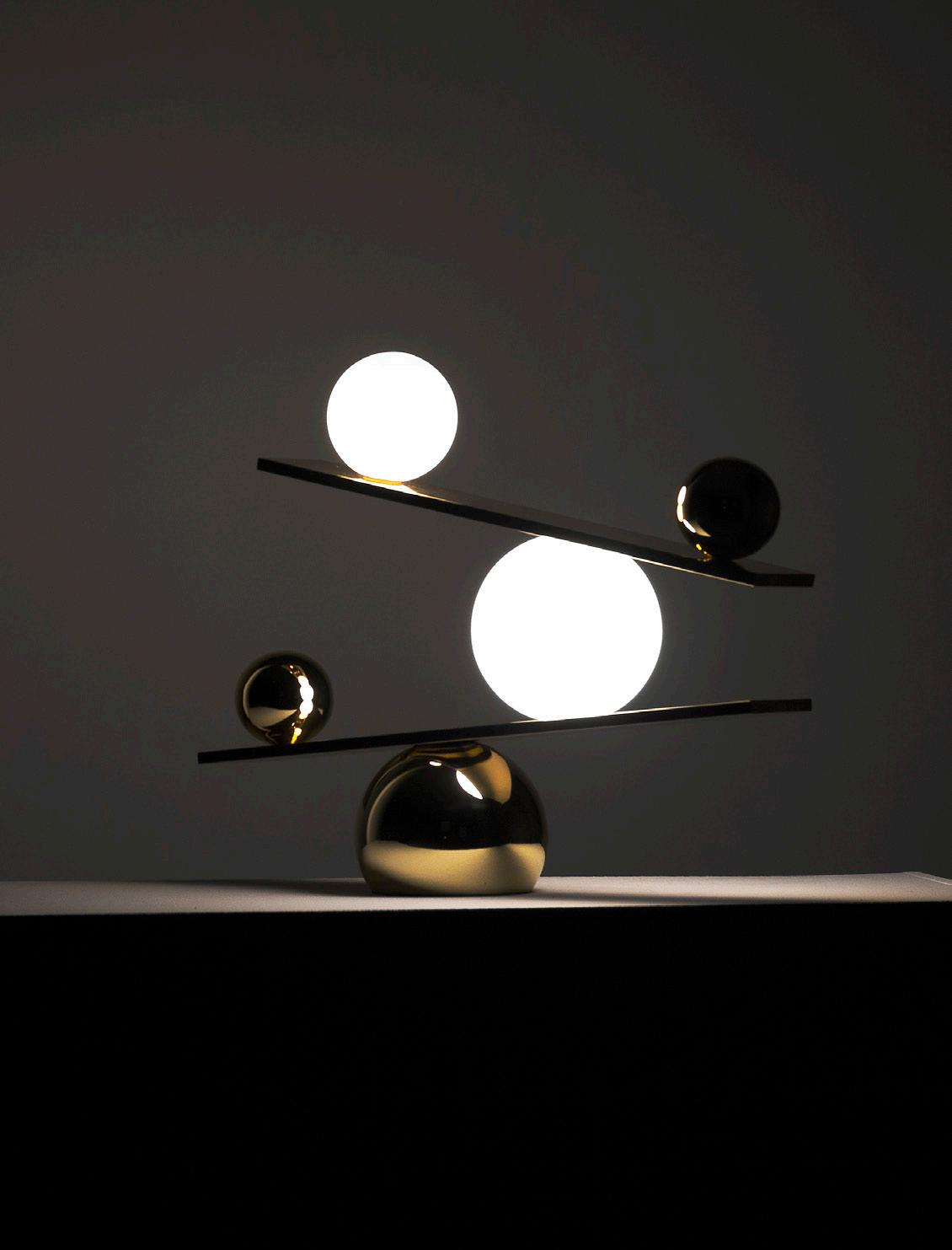 The construction is made from of a pair of glowing orbs poised between two slanted steel boards. The metal spheres seen on both sides have just the right density to counterweight the opposite part of the lamps’ weight. The overall structure is grounded on a robust foundation.