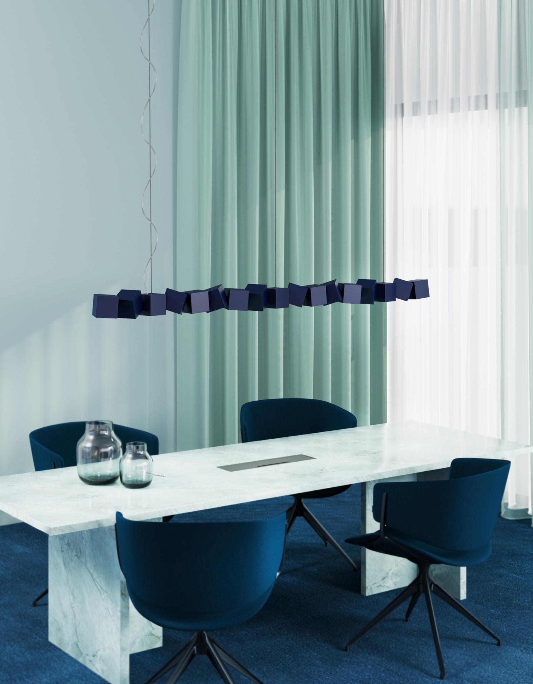 Description: Pendant lamp providing downlight from every second cubes. Dimmable LED driver(trailing edge) is provided and fitted in the canopy. Steel wire suspensions and transparent cable.