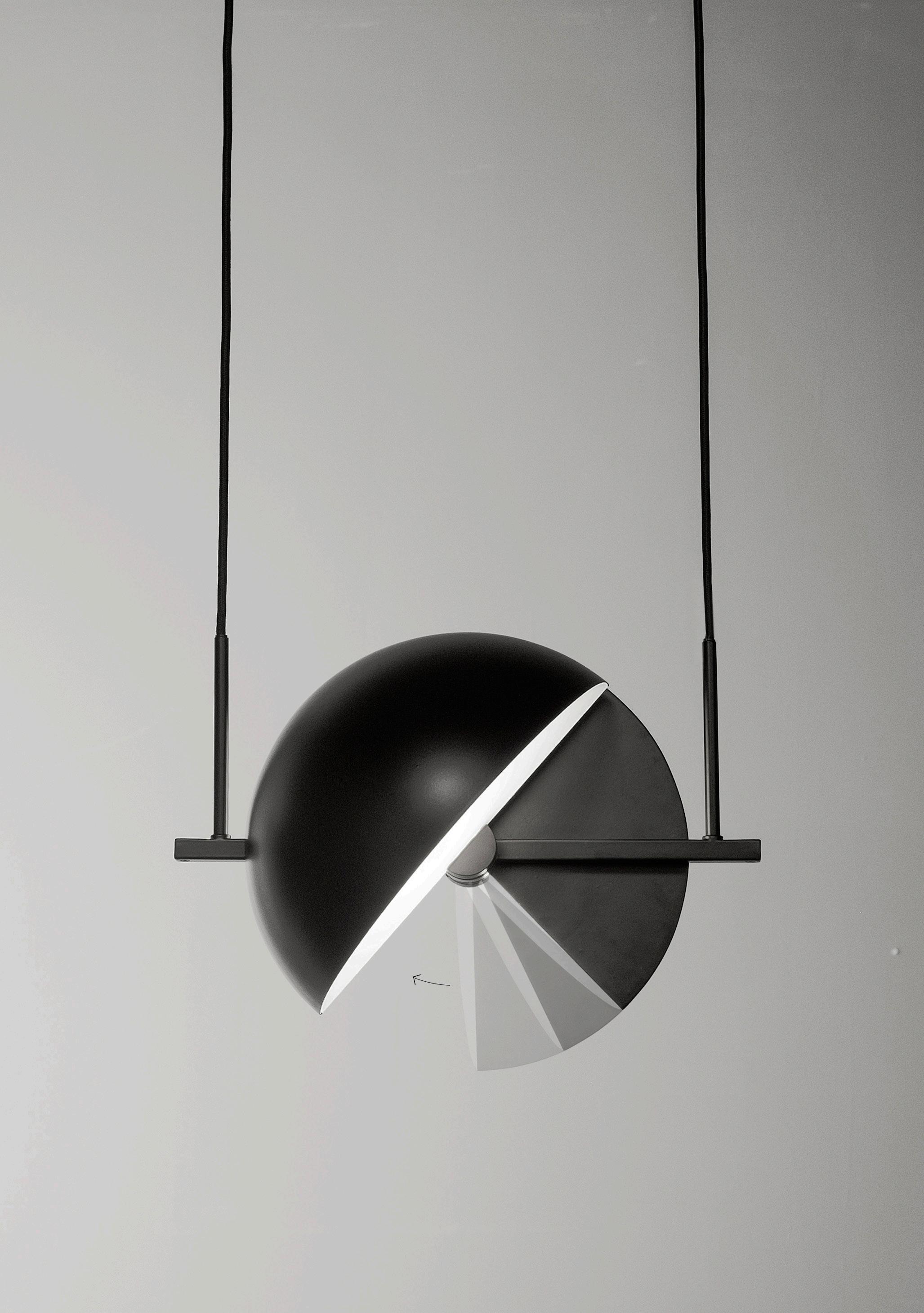 The overlapping patterns control the luminous effect through the movement of the metallic shades. Antonio Facco has created a sophisticated lamp that invites the user to become a co-designer.