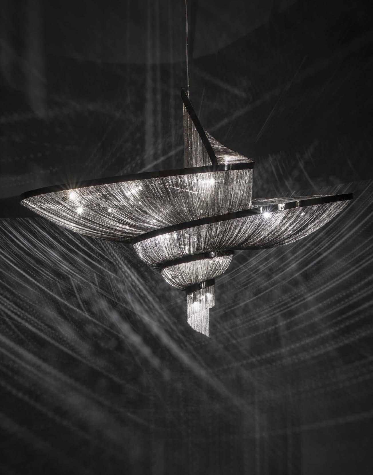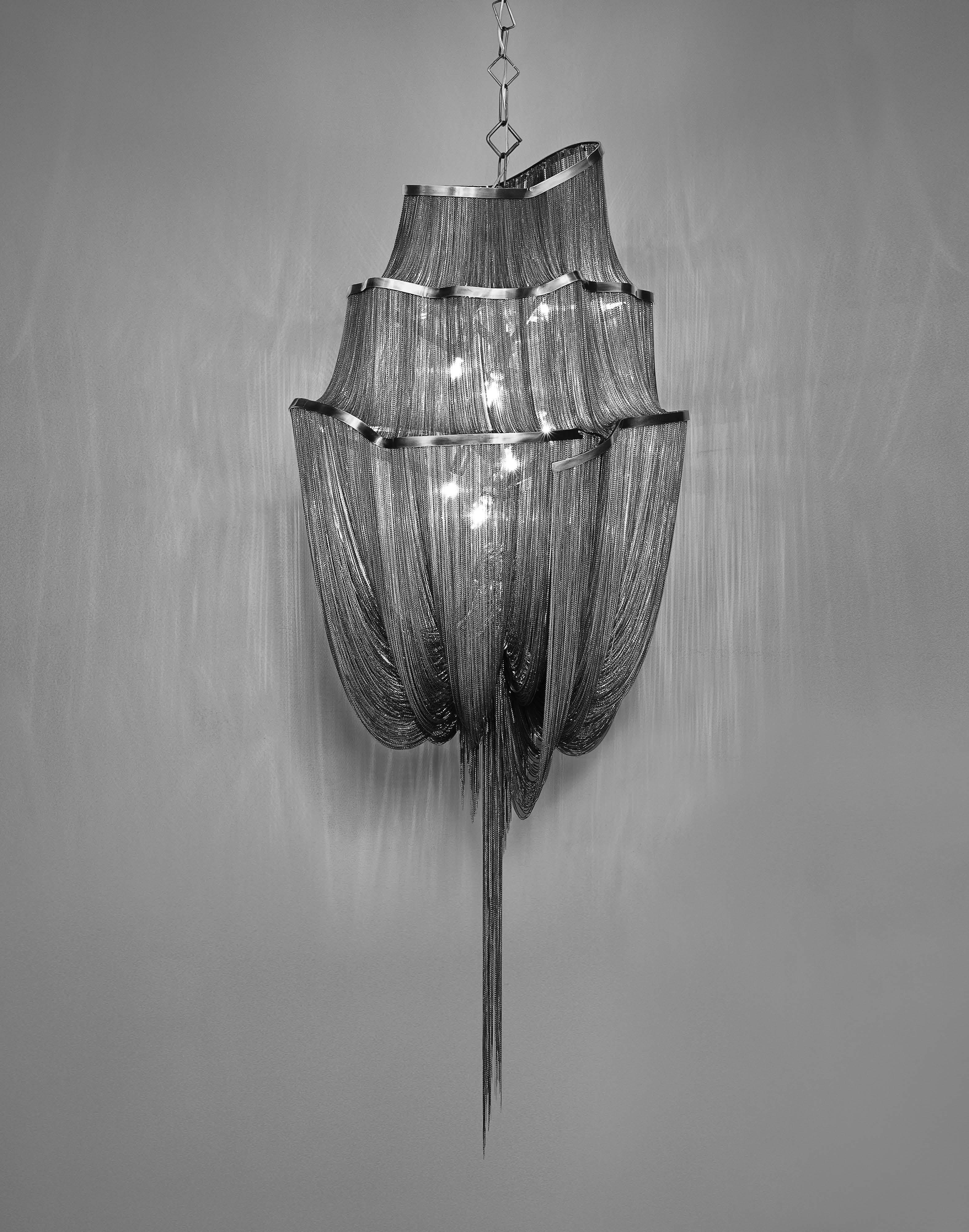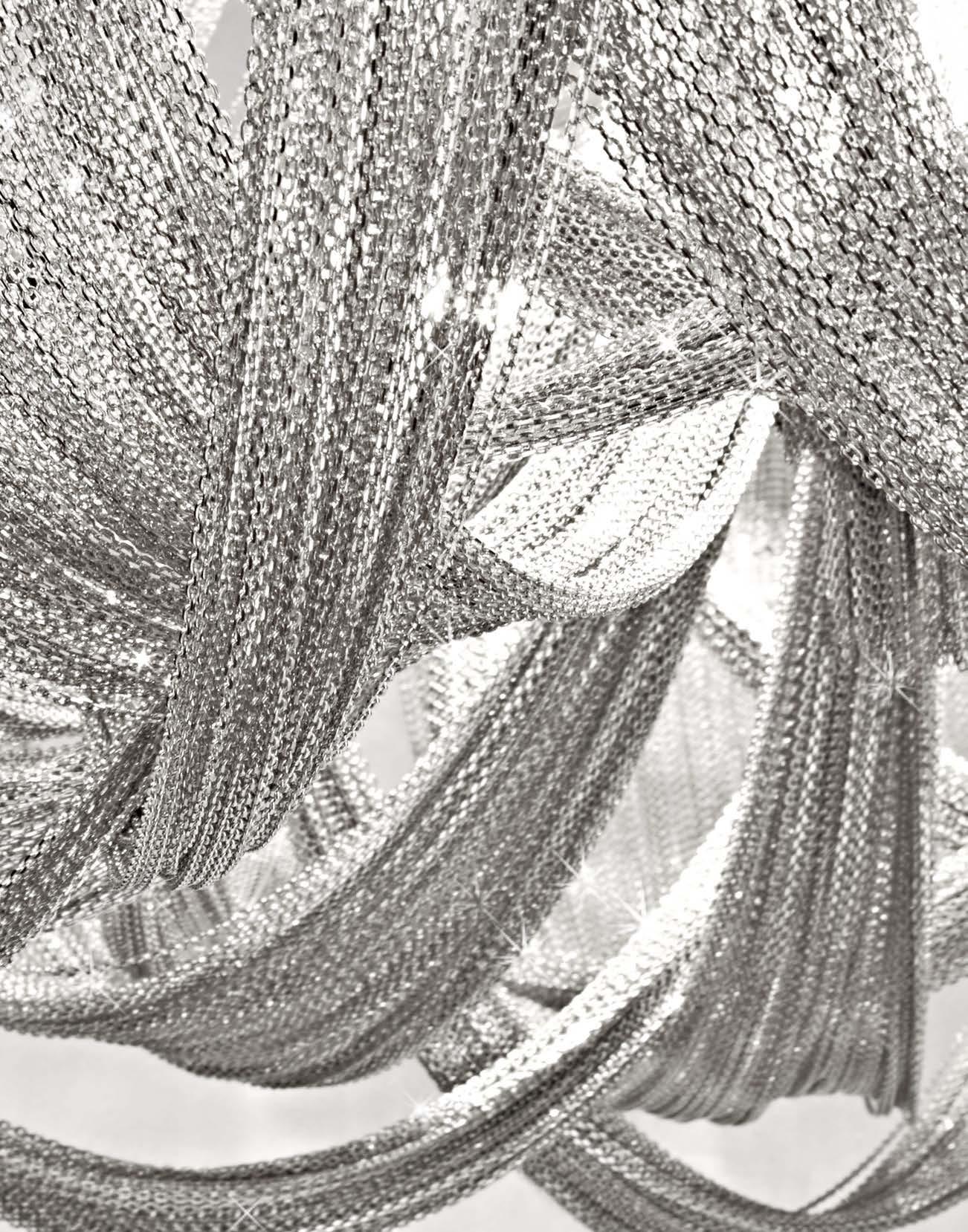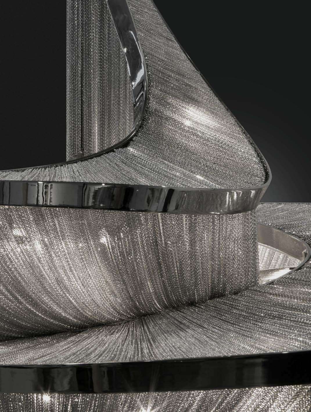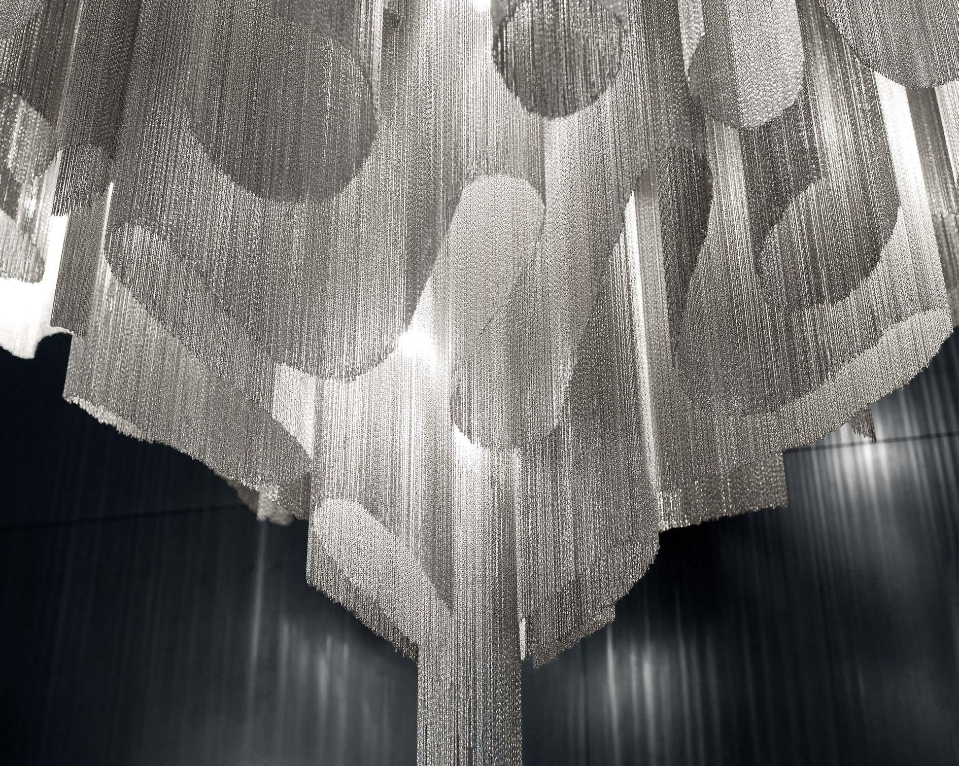 Seemingly alive, Atlantis' shimmering light creates a vibrant source of energy. Its mesmerizing, organic effect is created by hundreds of illuminated lengths of draped chains. Like water in the ocean, Atlantis's chains appear liquid, cascading over its gloss bands and falling down towards the abyss before turning back into itself. Atlantis is composed of almost three miles of chain, meticulously hand-crafted by master Italian artisans. Design Barlas Baylar.