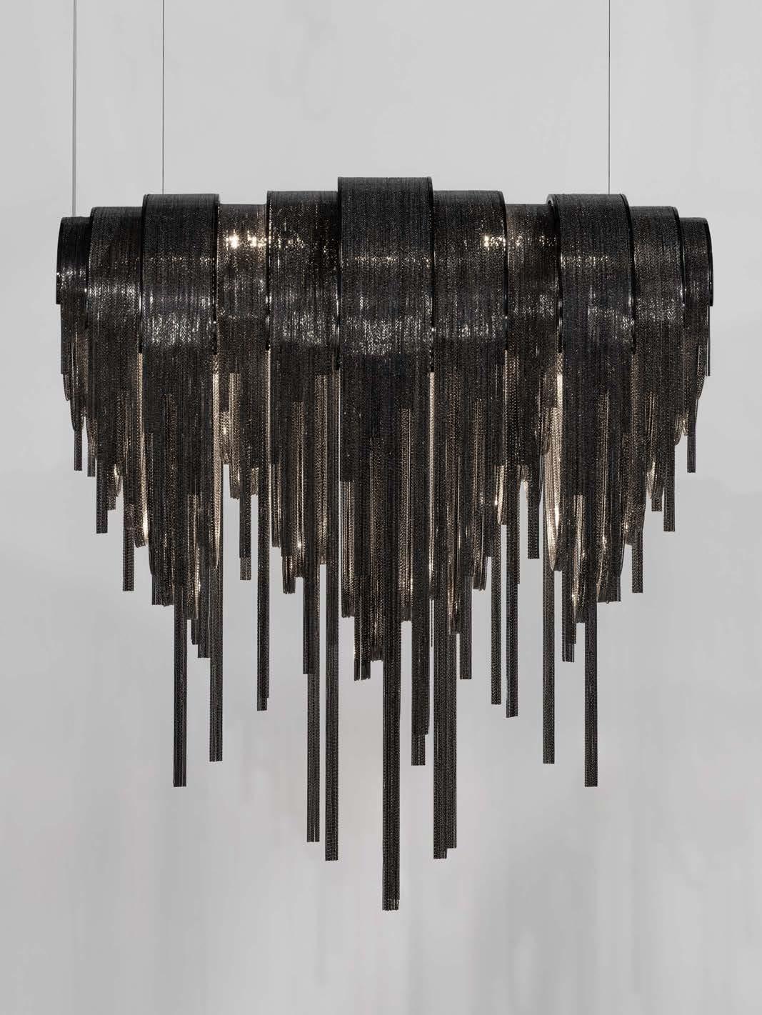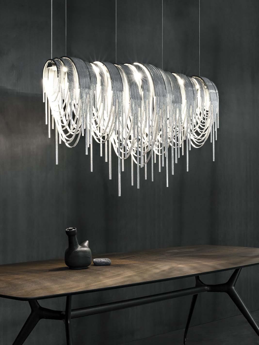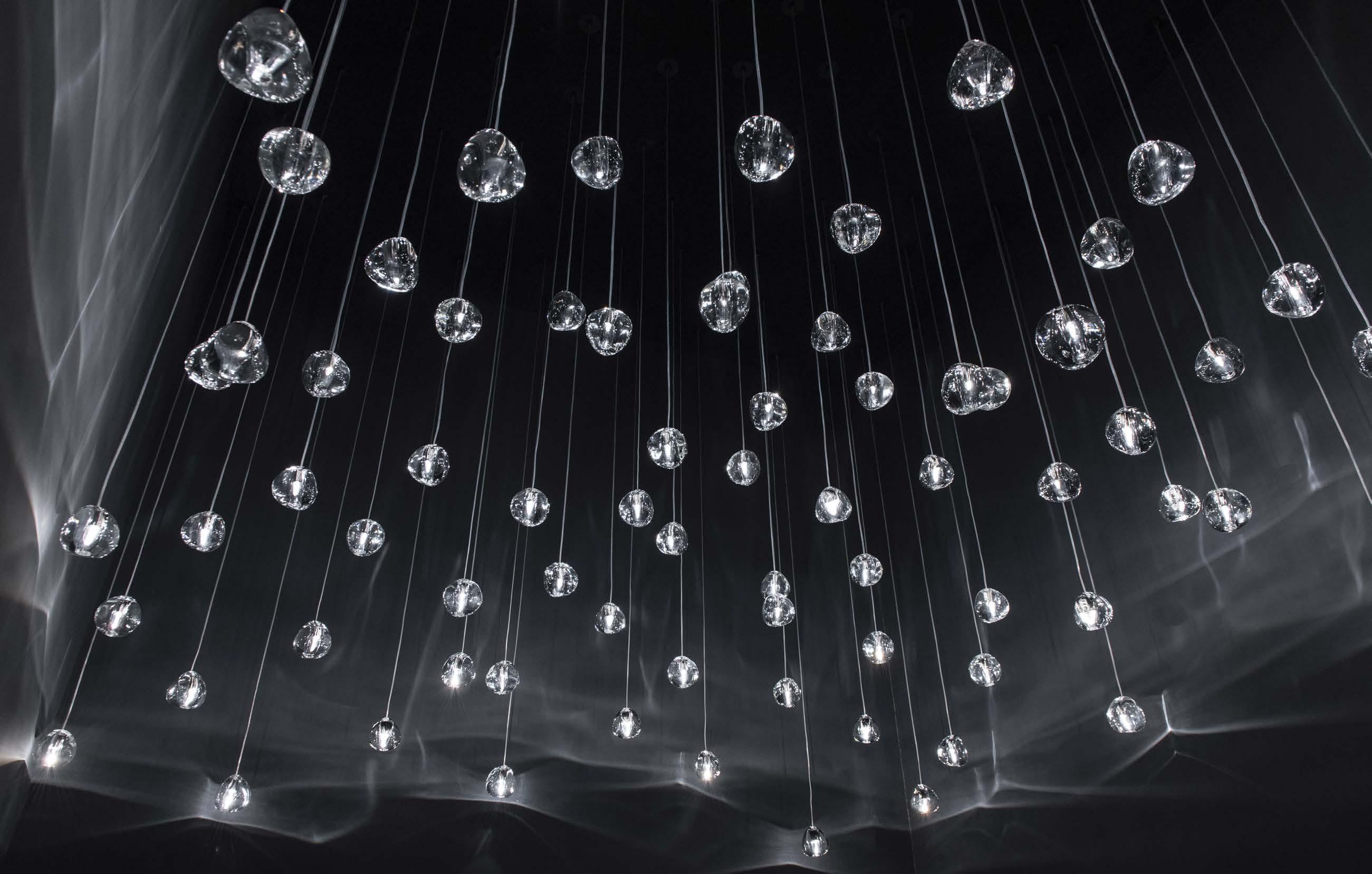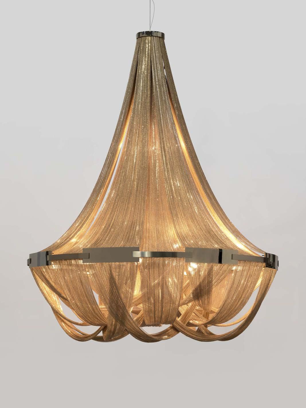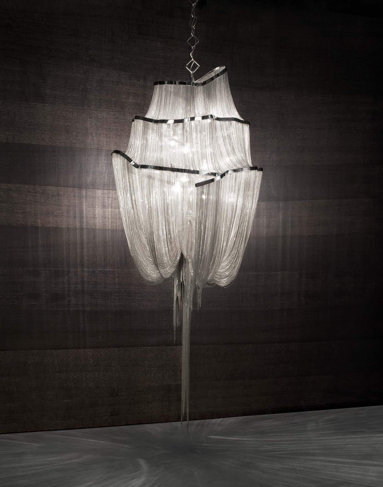 Seemingly alive, Atlantis' shimmering light creates a vibrant source of energy. Its mesmerizing, organic effect is created by hundreds of illuminated lengths of draped chains. Like water in the ocean, Atlantis's chains appear liquid, cascading over its gloss bands and falling down towards the abyss before turning back into itself. Atlantis is composed of almost three miles of chain, meticulously hand-crafted by master Italian artisans. Design Barlas Baylar.
