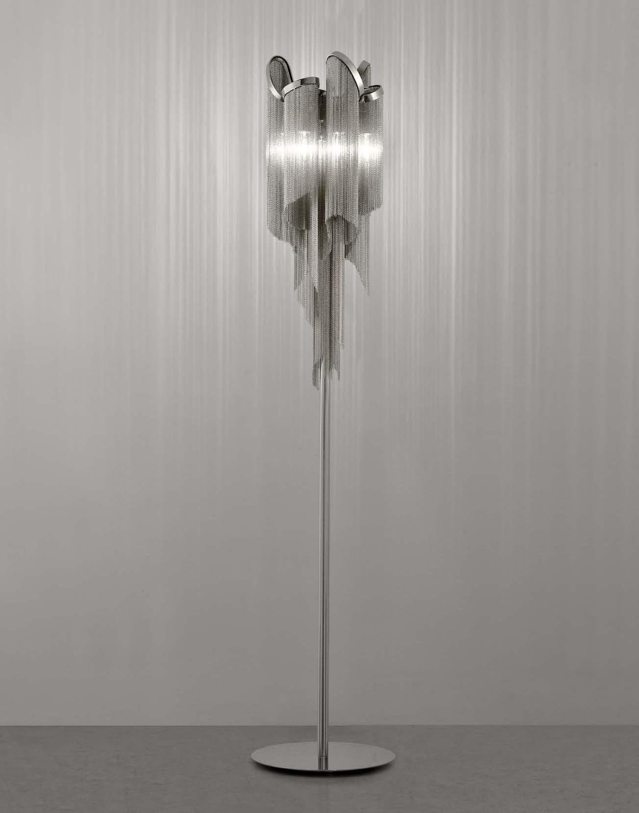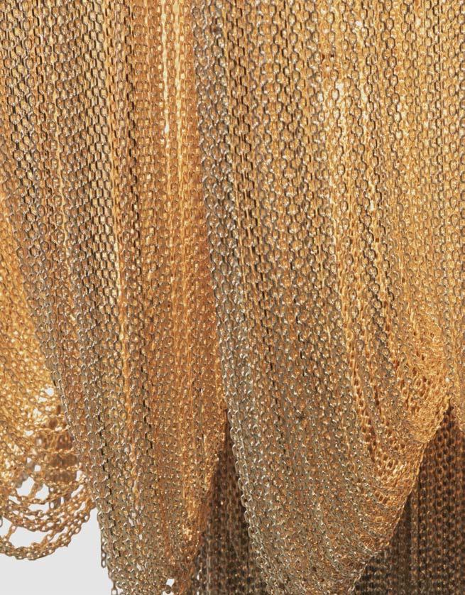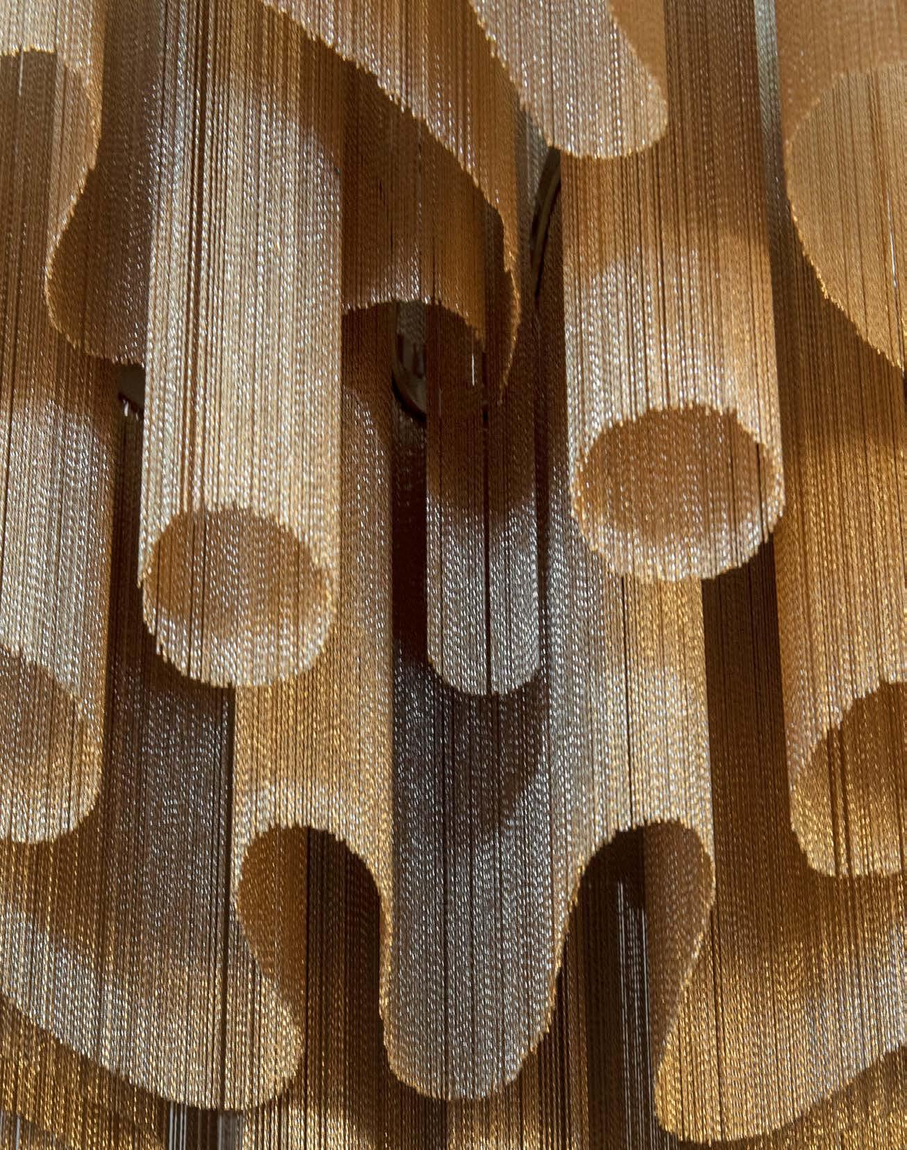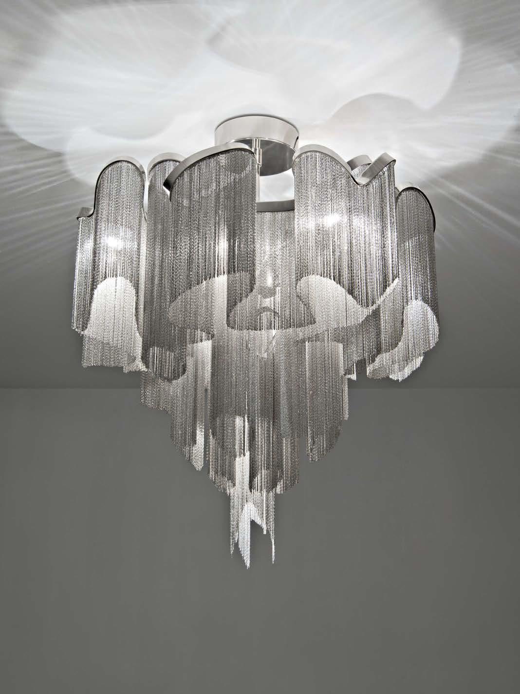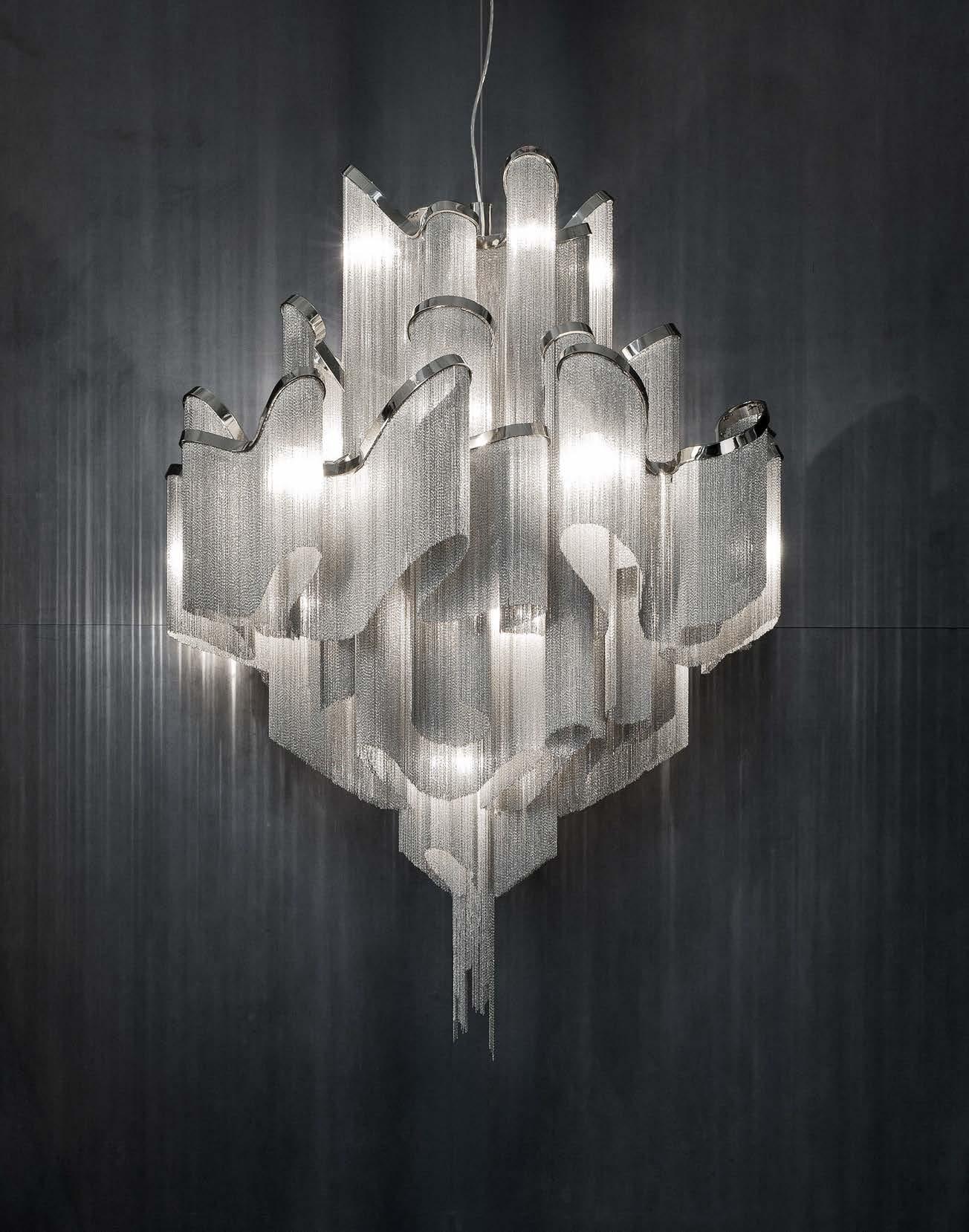 Seemingly alive, Atlantis' shimmering light creates a vibrant source of energy. Its mesmerizing, organic effect is created by hundreds of illuminated lengths of draped chains. Like water in the ocean, Atlantis's chains appear liquid, cascading over its gloss bands and falling down towards the abyss before turning back into itself. Atlantis is composed of almost three miles of chain, meticulously hand-crafted by master Italian artisans. Design Barlas Baylar.