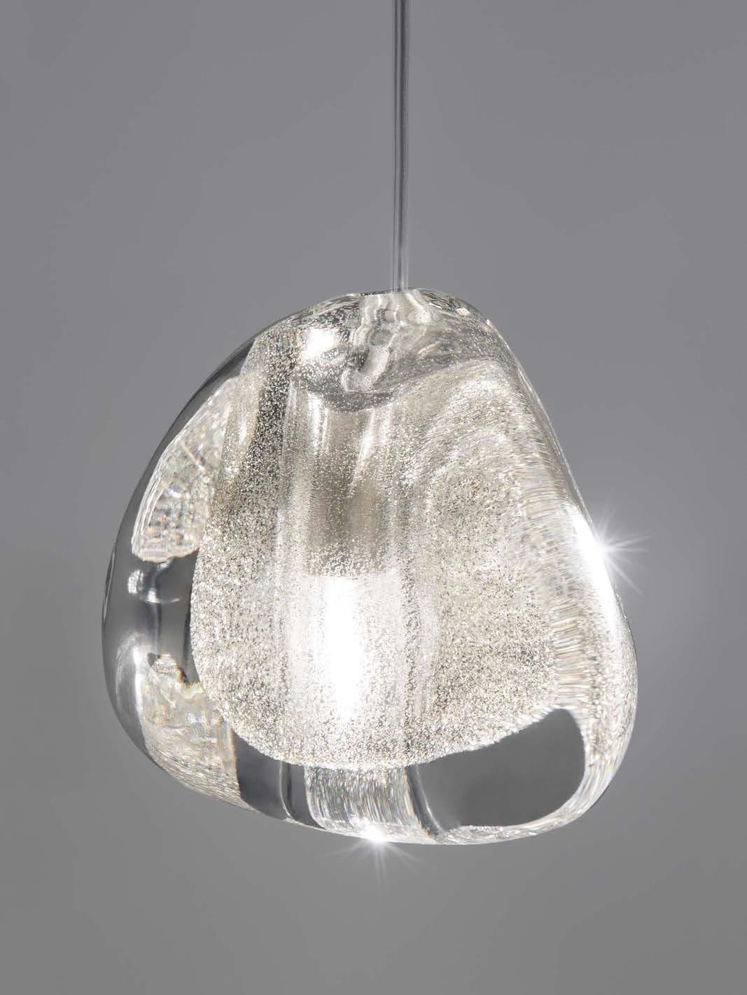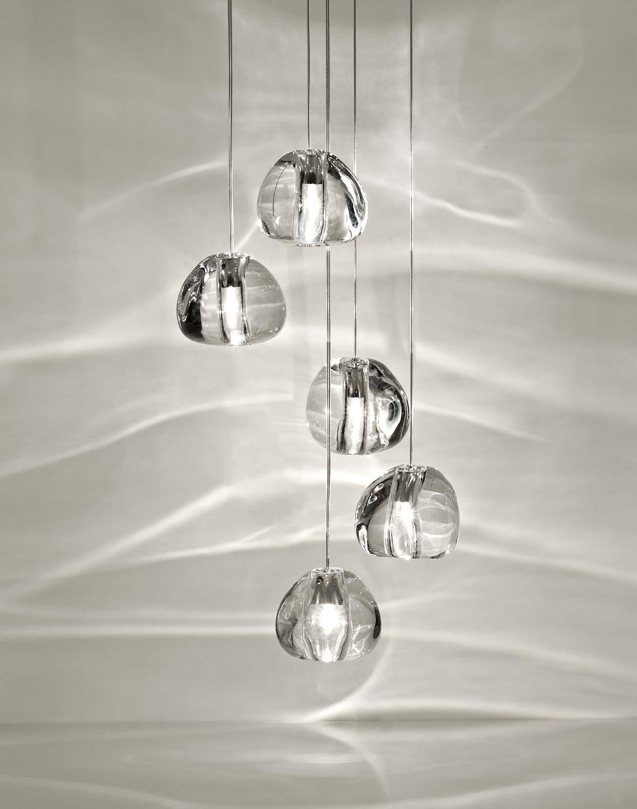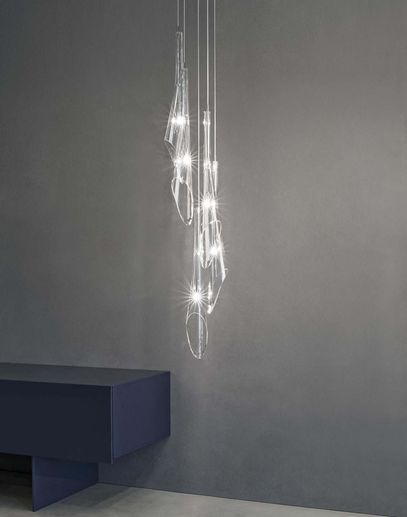 Inspired by the tranquil and mesmerizing light refractions created by water, Mizu is a customizable pendant light from Terzani. Like water droplets, no two Mizu are alike; each crystal shape is unique and meticulously handmade. Using only the clearest crystal, Mizu perfectly emulates water’s refraction of light, casting amazing patterns around the room, reminiscent of flowing water. Available in clear, silver dust, gold, cognac, and champagne finish. Design Nicolas Terzani.
