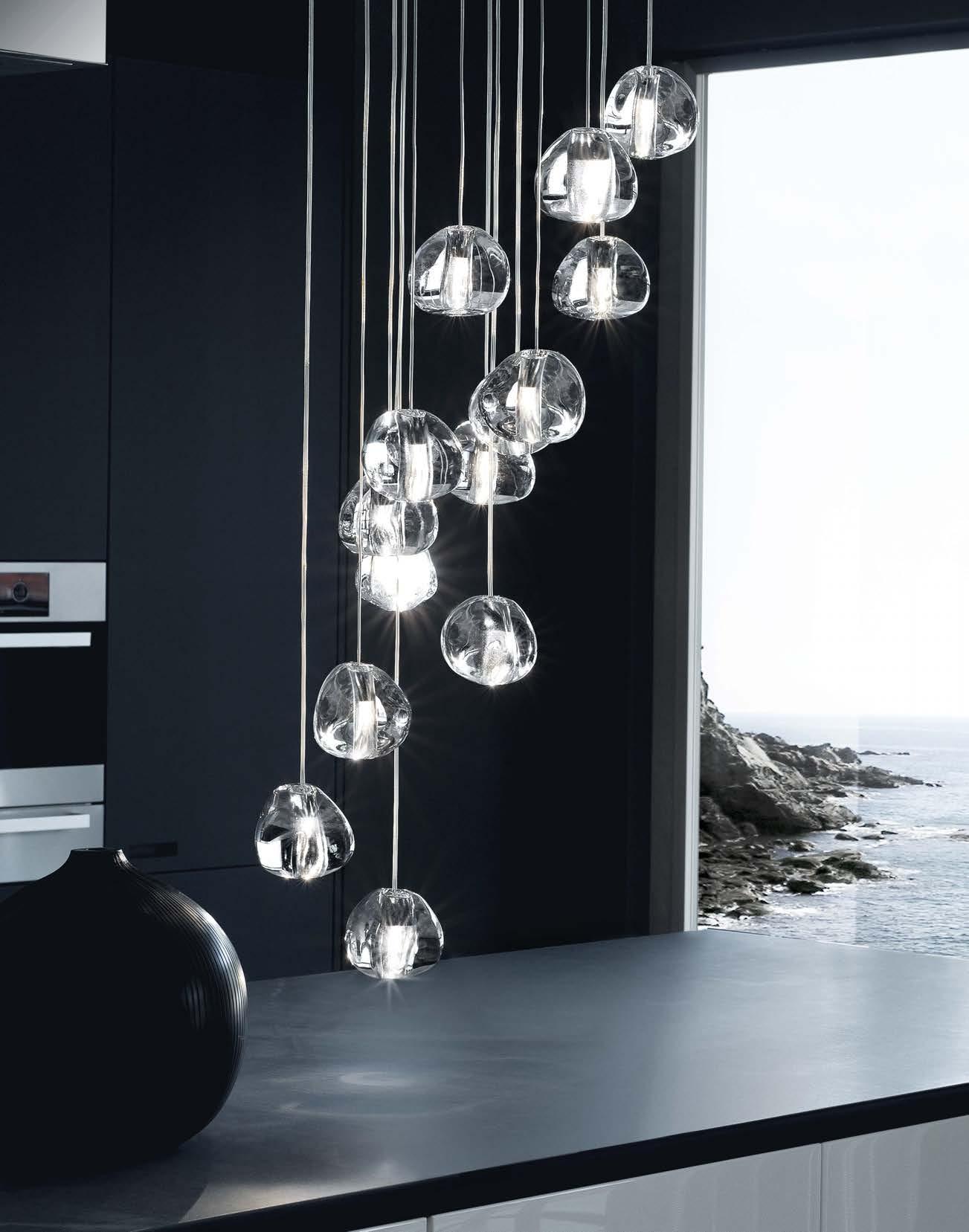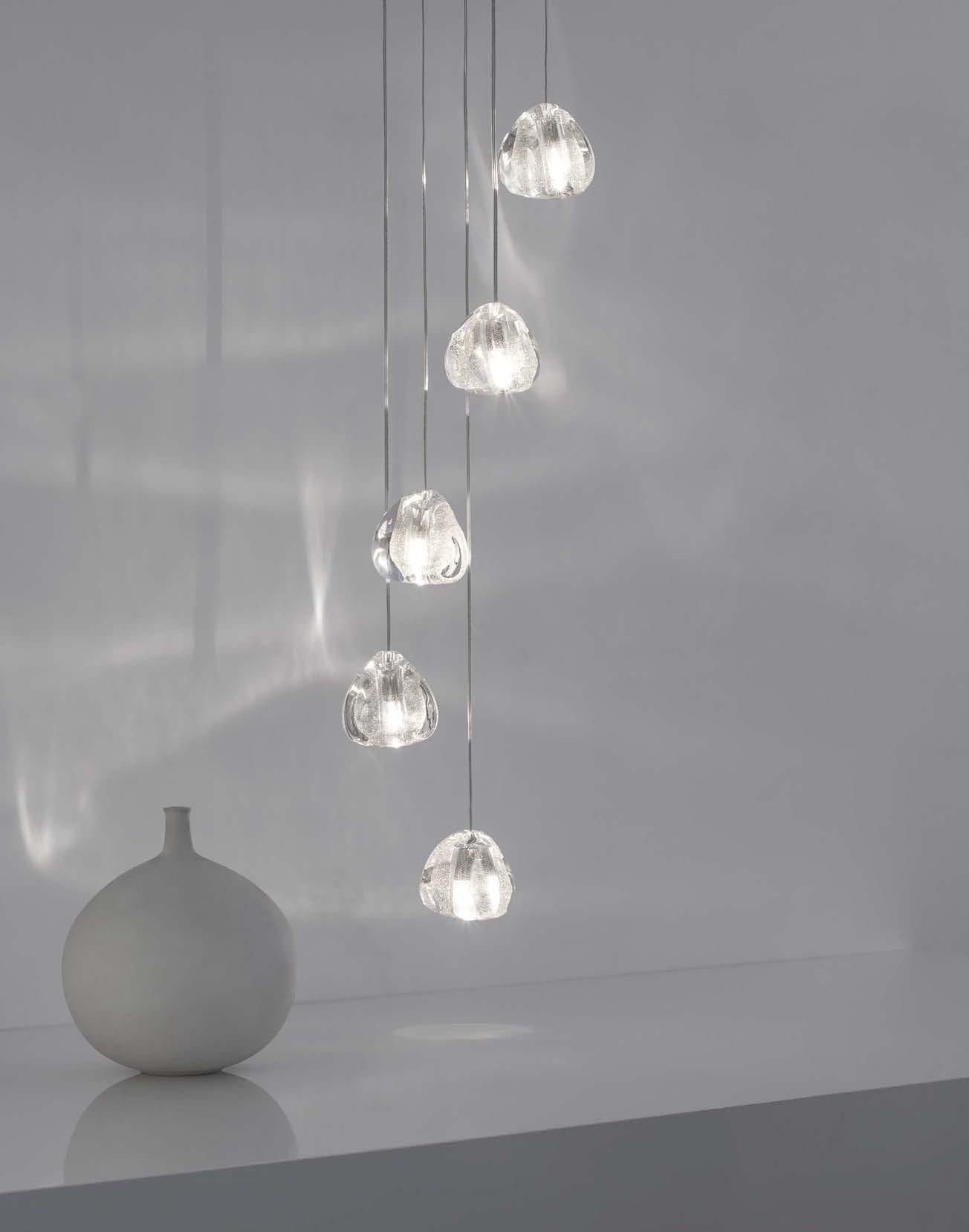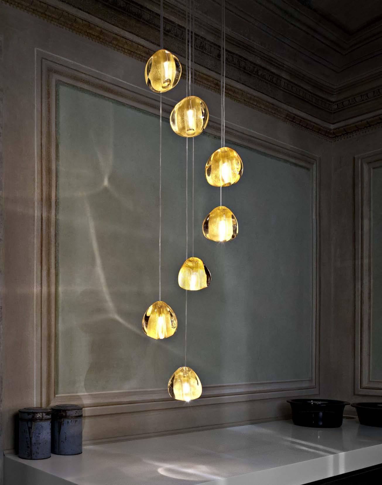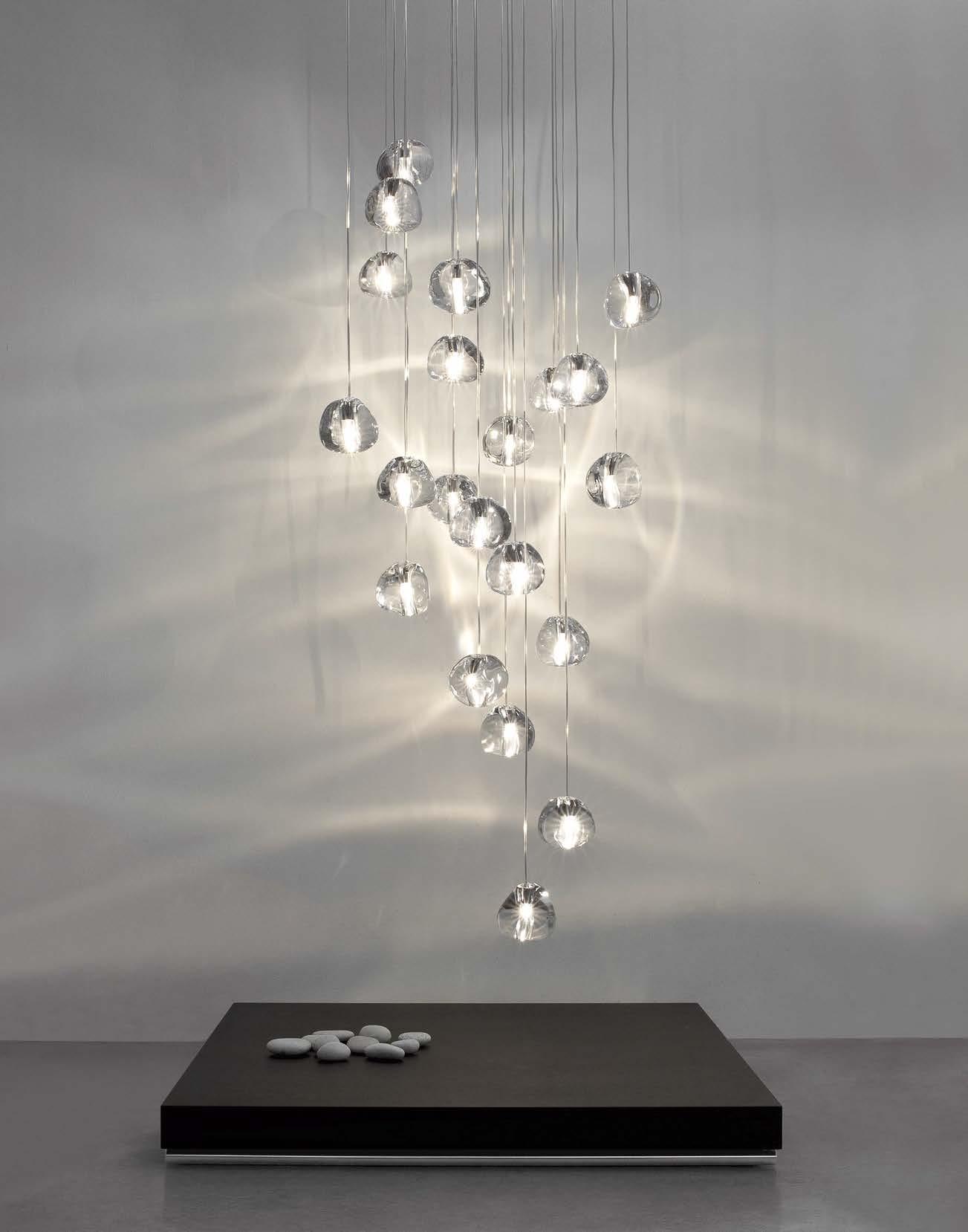 Inspired by the tranquil and mesmerizing light refractions created by water, Mizu is a customizable pendant light from Terzani. Like water droplets, no two Mizu are alike; each crystal shape is unique and meticulously handmade. Using only the clearest crystal, Mizu perfectly emulates water’s refraction of light, casting amazing patterns around the room, reminiscent of flowing water. Available in clear, silver dust, gold, cognac, and champagne finish. Design Nicolas Terzani.