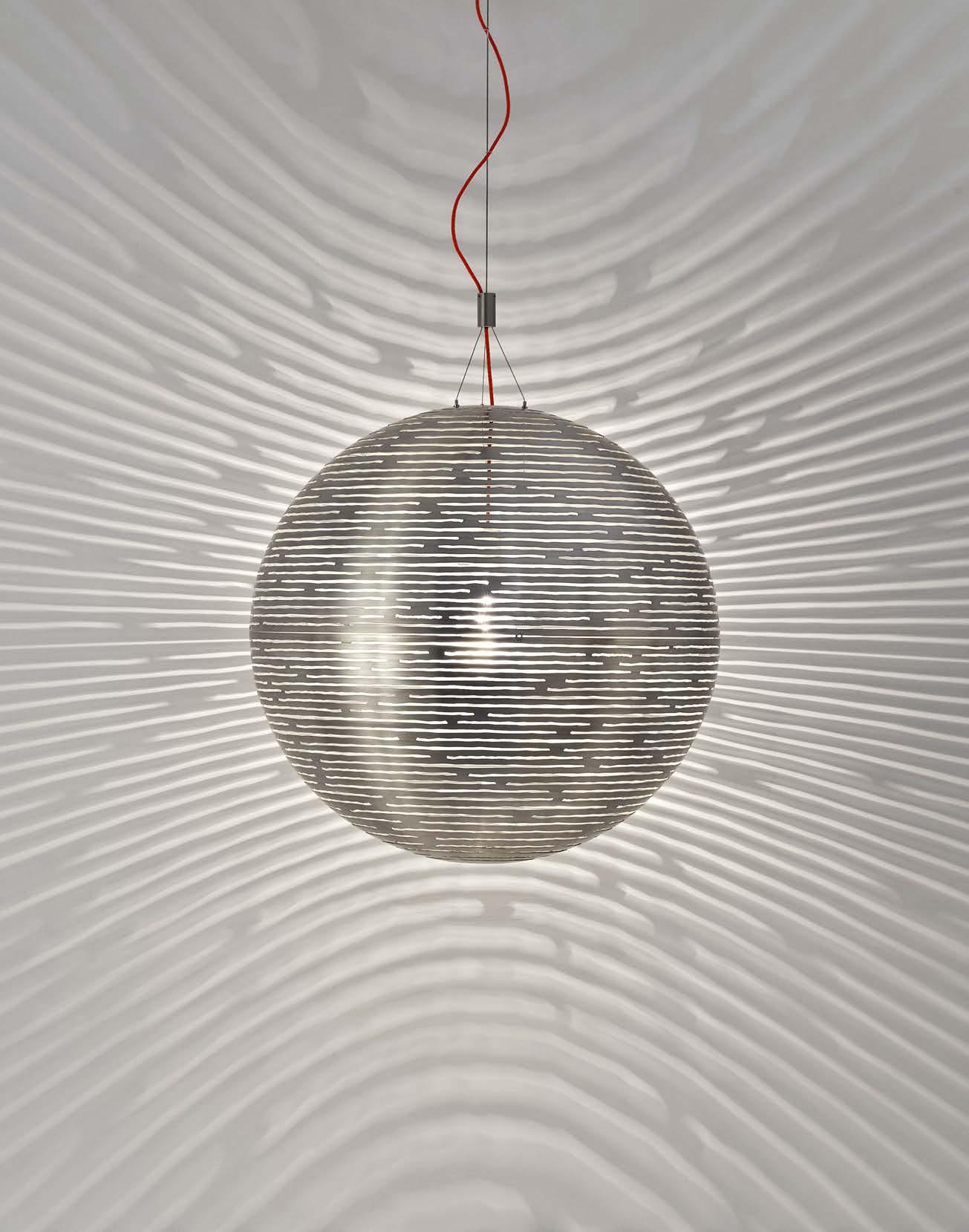 Reaching inside traditional forms, Magdalena’s laser-cut horizontal openings allow its light to expand its range to the entire room. Creating an alluring pattern of light and shadow, Magdalena highlights the shape of the room itself. This unique exchange creates a pendant that impacts every space, regardless of size. Design Bruno Rainaldi.