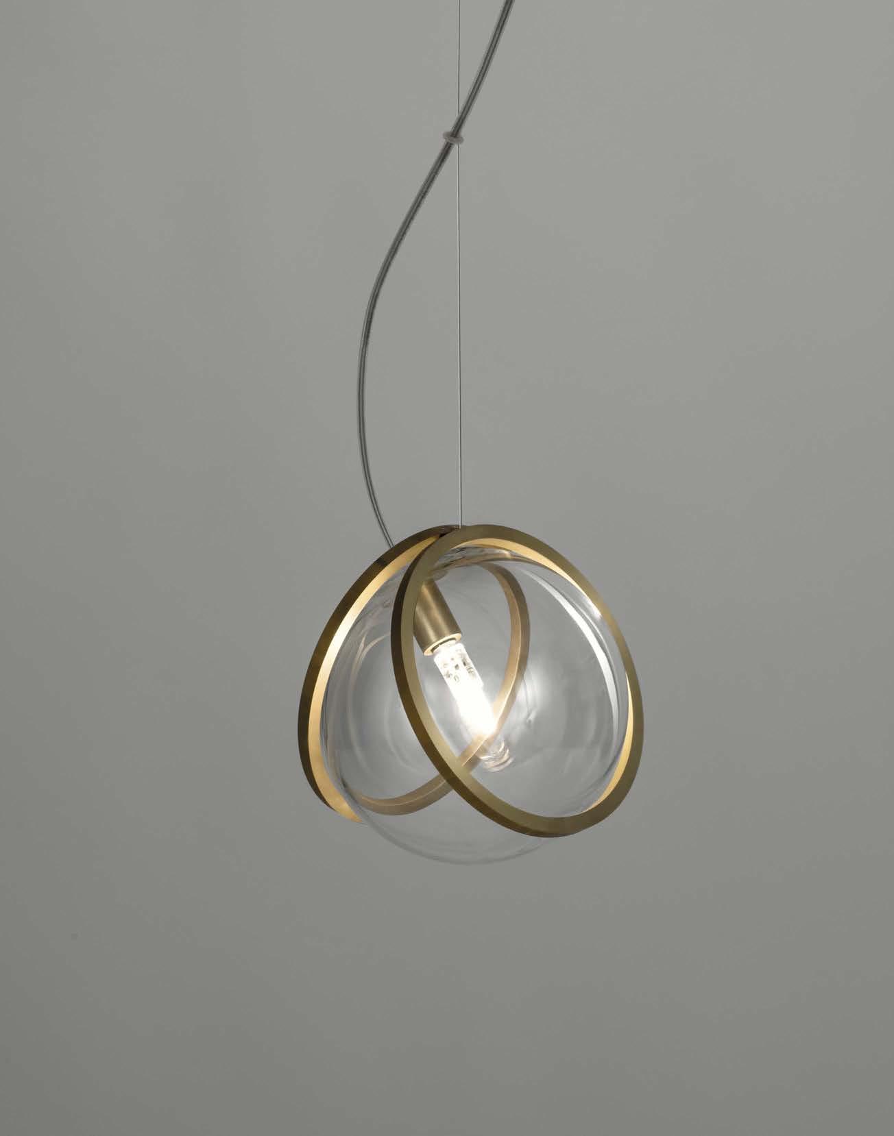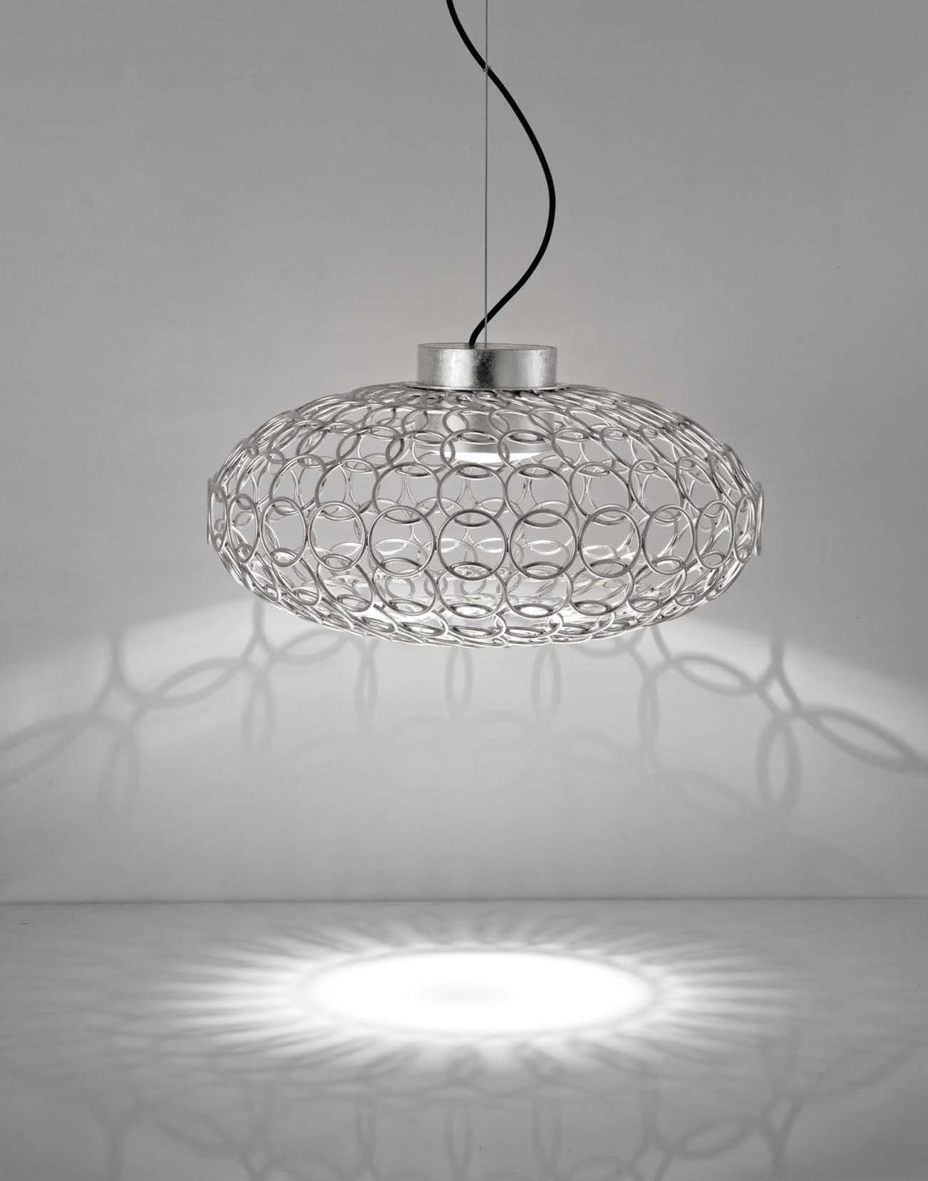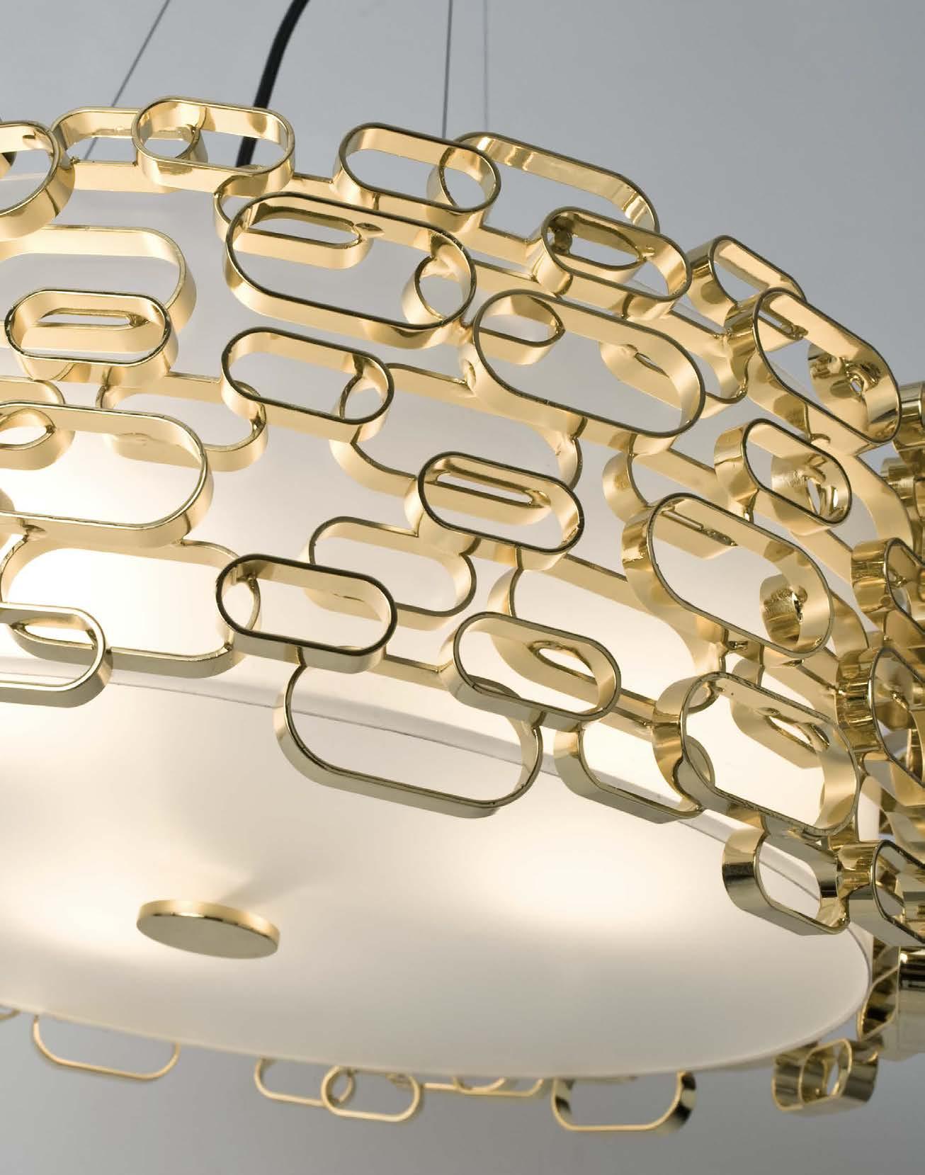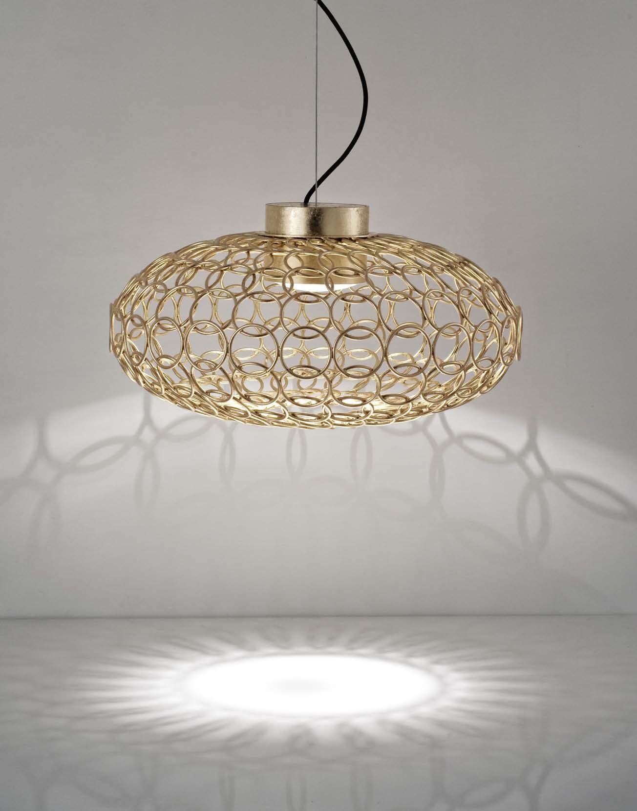 This clean, precise form is the result of hours of labor by our artisans, who meticulously weld each ring together. G.r.a. is a delicate, refined pendant whose intricate shape belies its romantic glow. Available as an oval or a sphere and finished in nickel, gold plated, or gold leaf, G.r.a. serves as an elegant, unobtrusive complement to any room. Design Bruno Rainaldi.