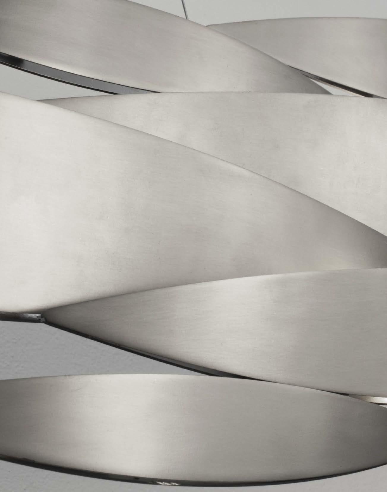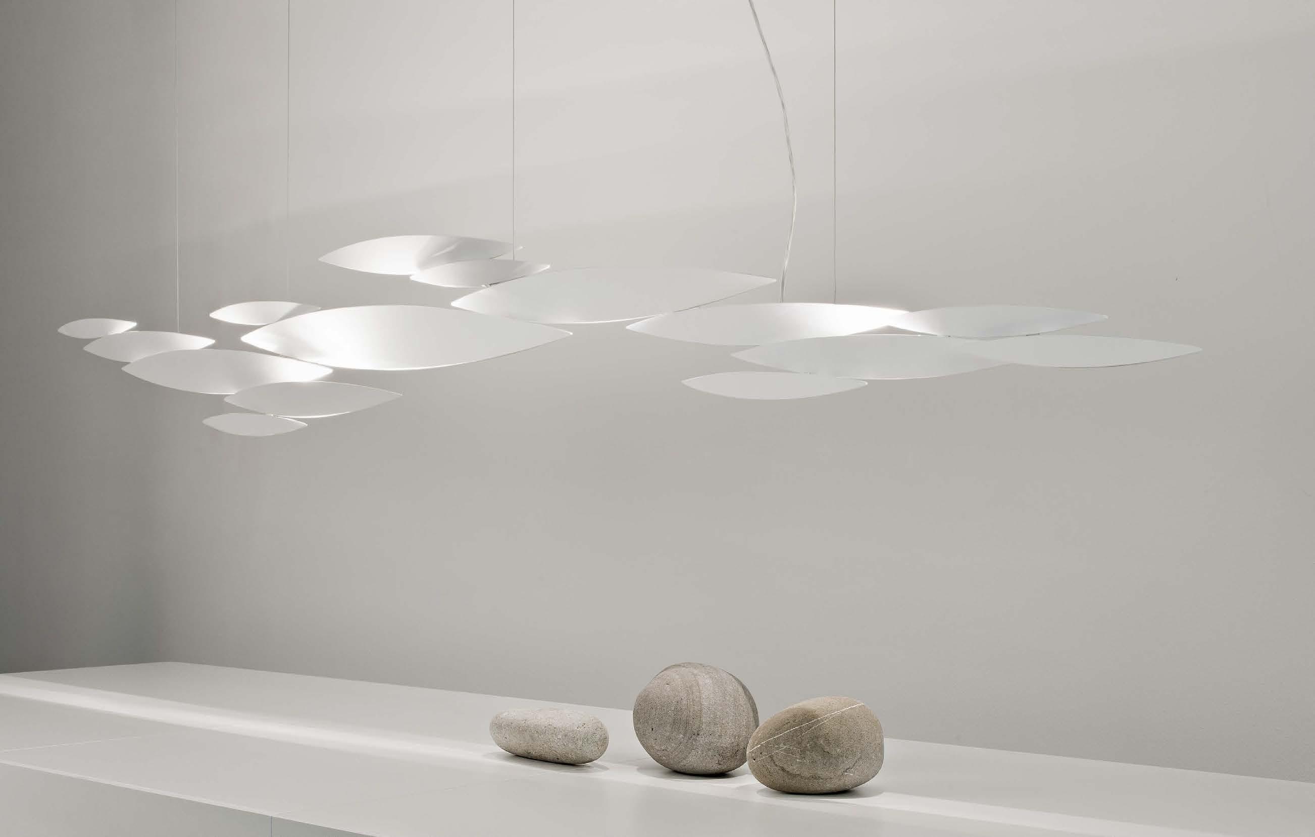 I Lucci Argentati draws from nature to create a whimsical, yet modern light. Recalling a school of fish darting through freshwater, it creates a mesmerizing luminescence. Sets of sleek elements combine to form a stunning pendant with thin incisions along the bottom, creating an understated, tranquil beauty. Thanks to its modular system, I Lucci Argentati is customizable and can be combined in many different configurations: from small to extra large, and finished either in brushed nickel, brushed gold, or white. Design Dodo Arslan.