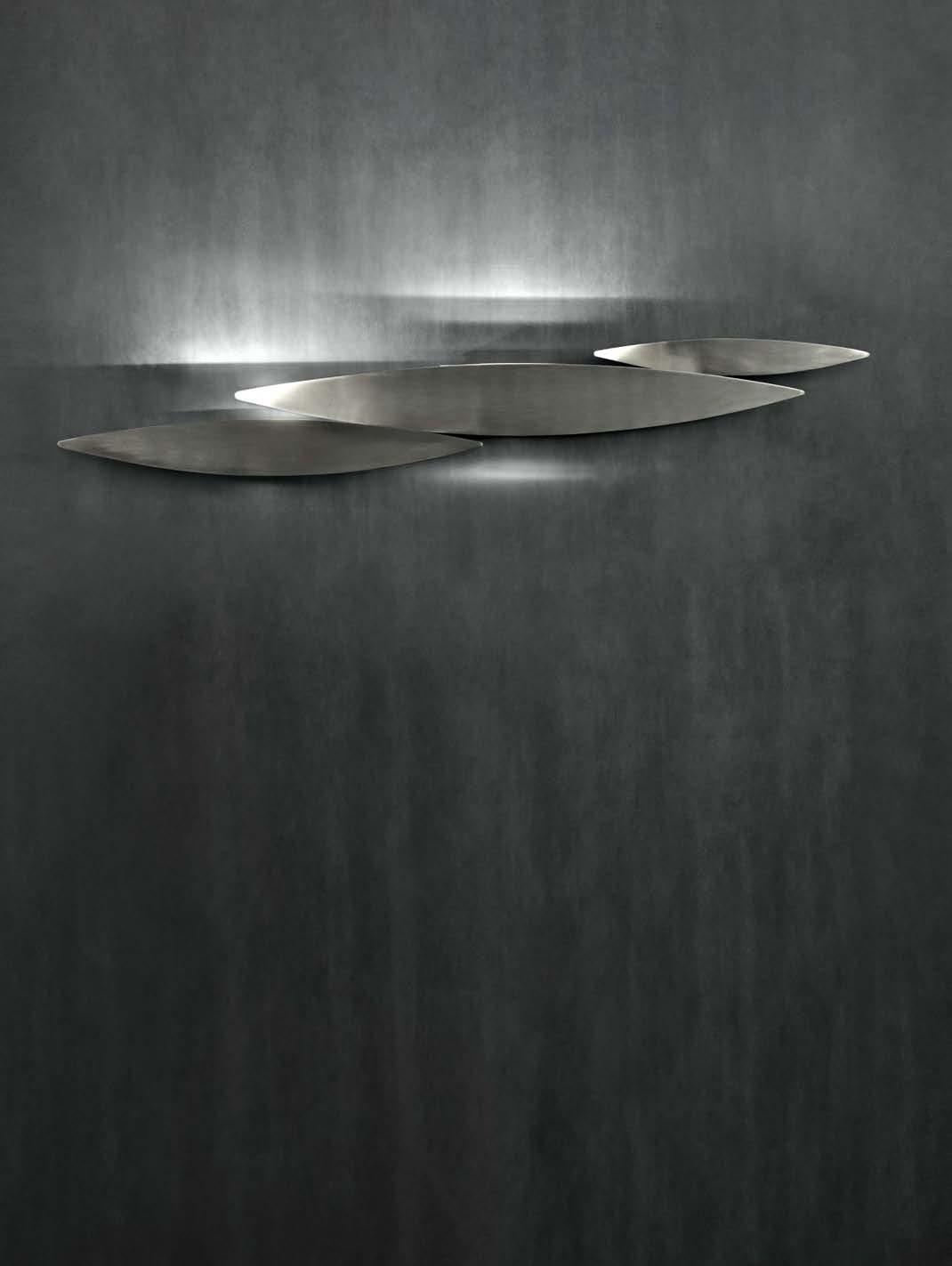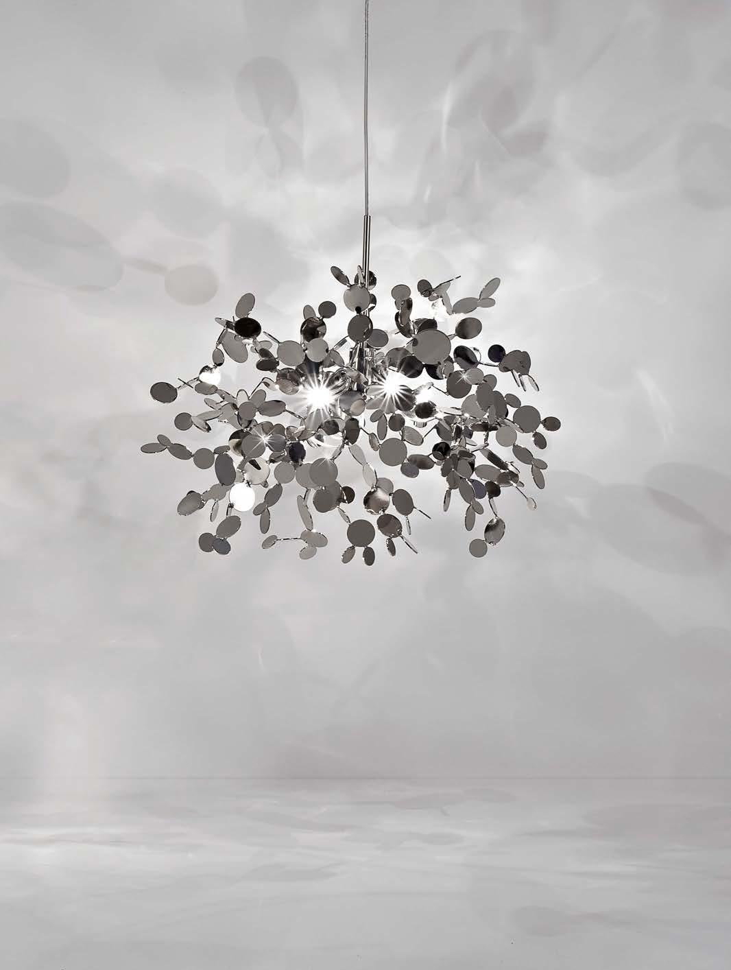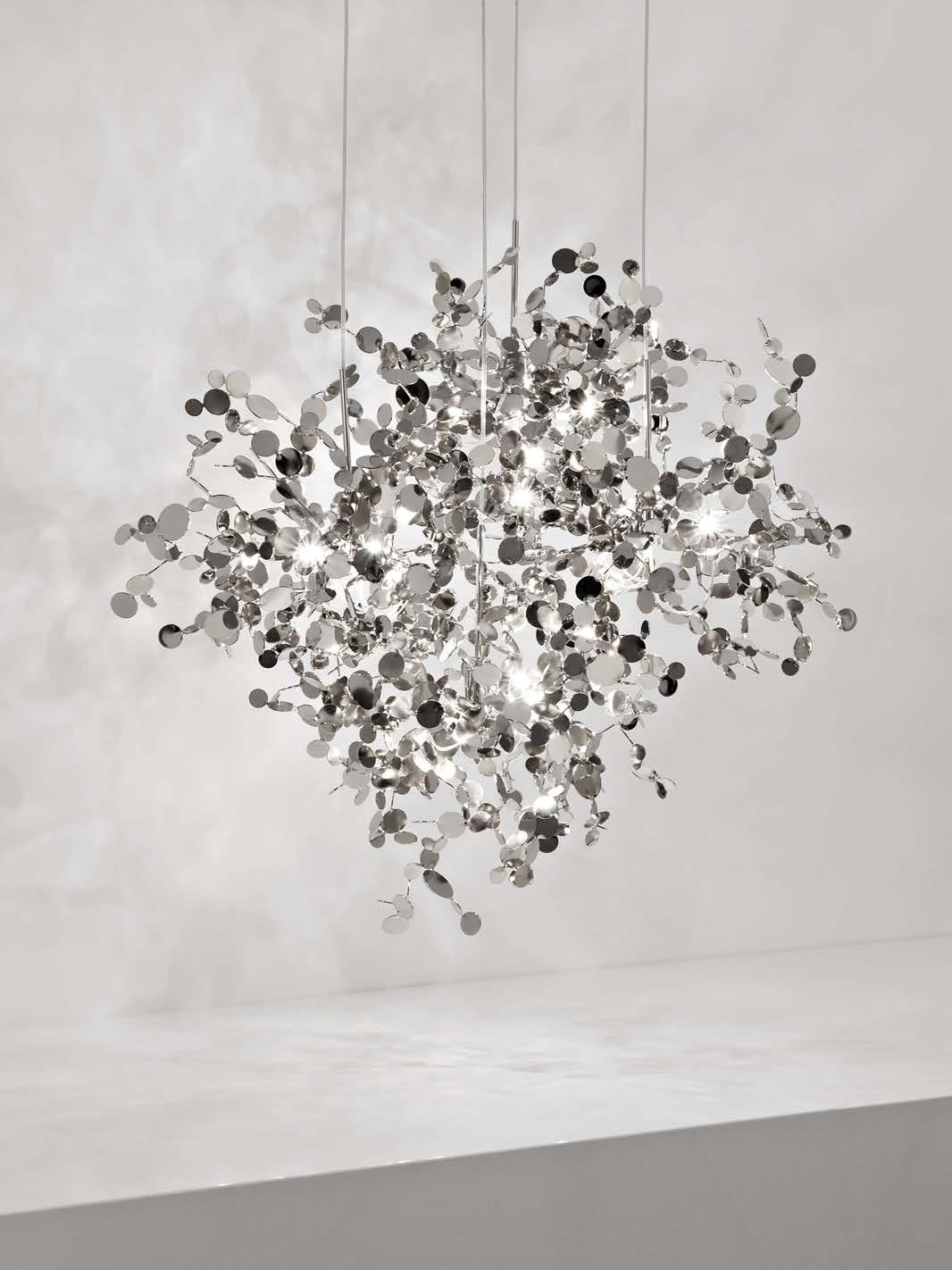With this light, designer Dodo Arslan creates a shimmering cloud. Argent consists of metal discs that have been meticulously shaped by Terzani craftsmen into clusters. Once lit, the multiple angled surfaces of the discs emanate a soft, shimmering glow. Argent is available in stainless steel, gold plated, rose gold plated, and champagne plated finishes. Black nickel plated is available on request. Design Dodo Arslan.