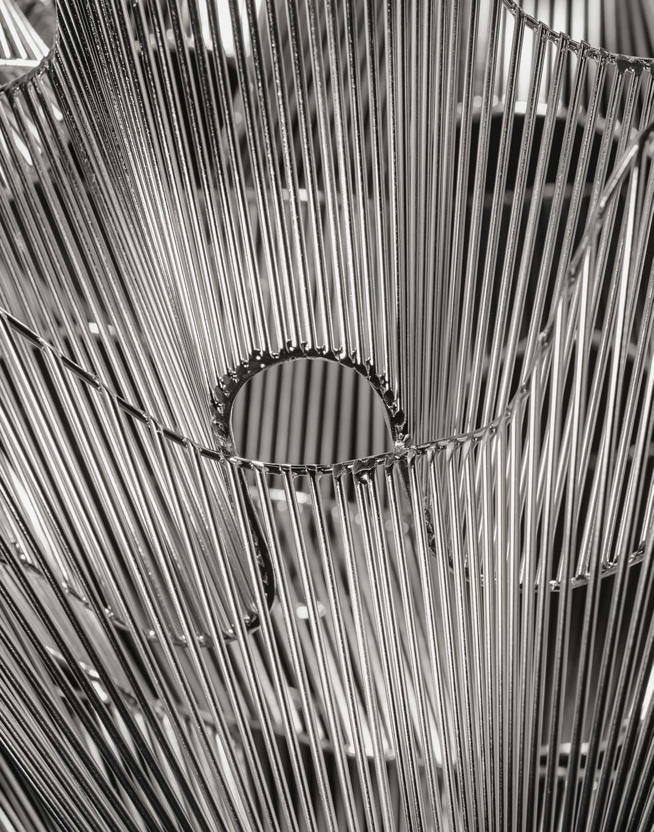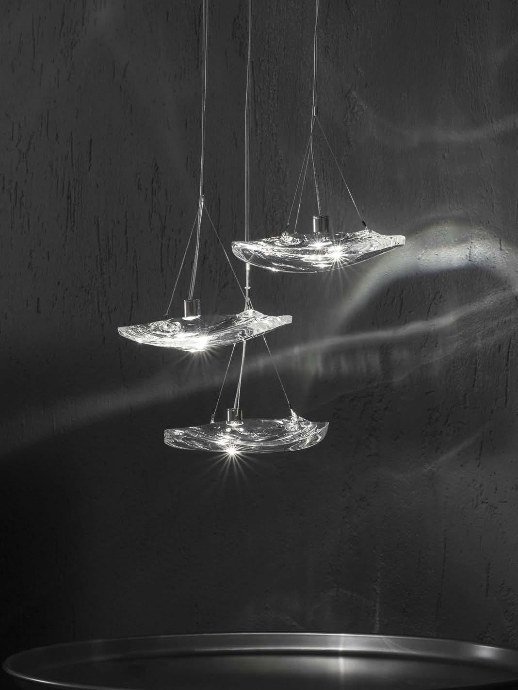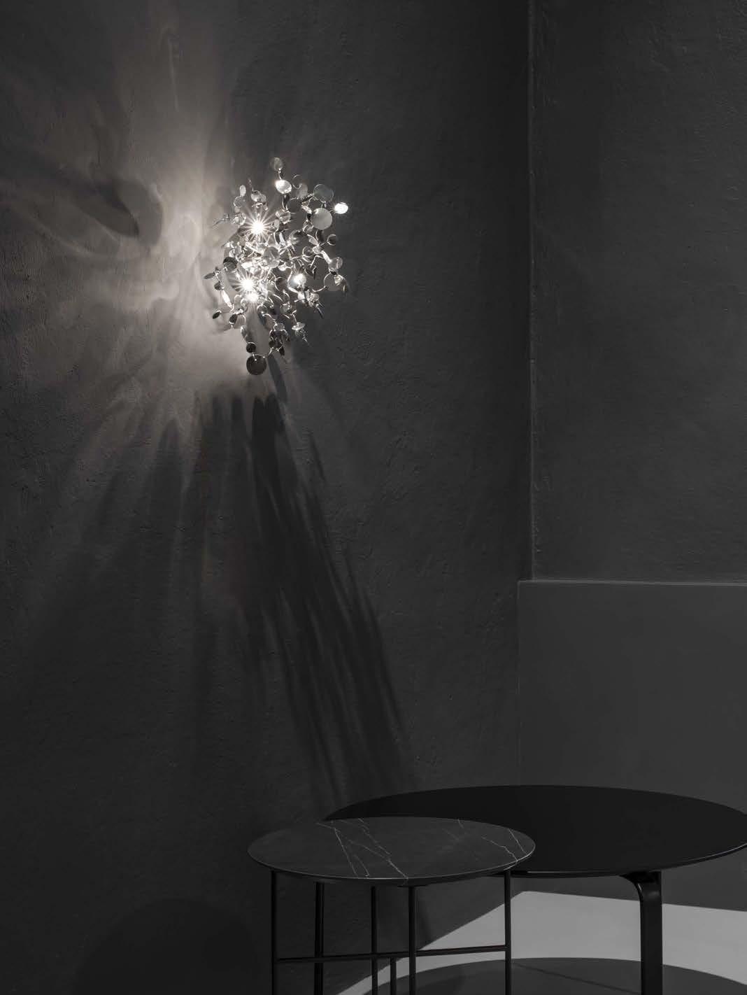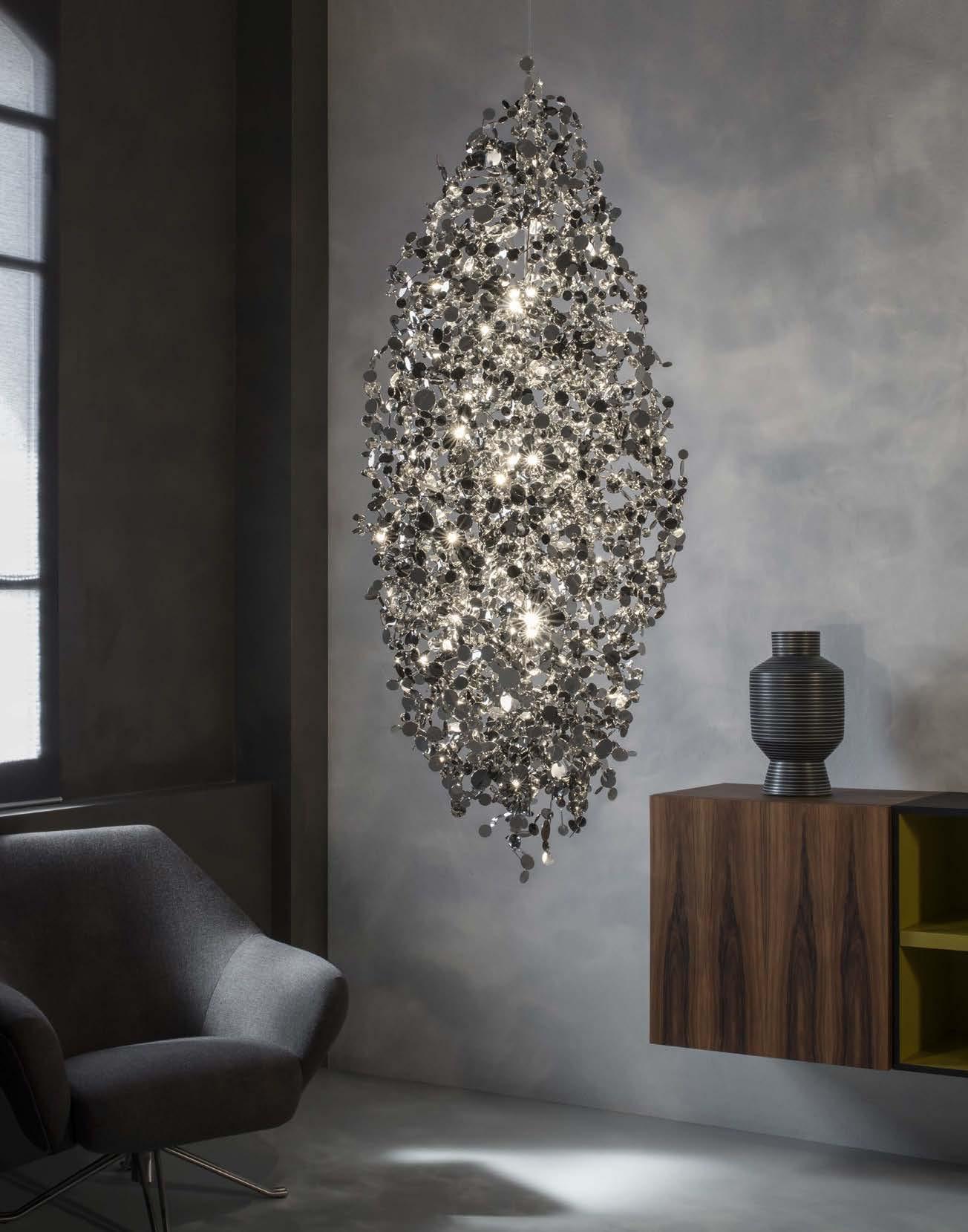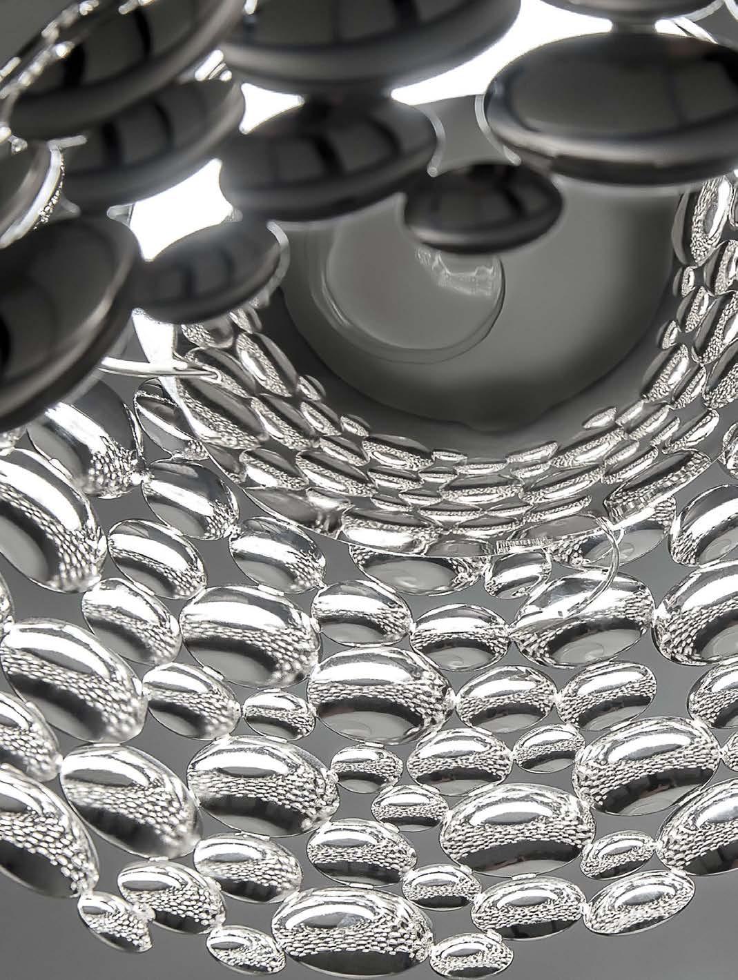 AAgain, partnering with Dodo Arslan, we asked ourselves: what have we learned from our evolution as designers and craftsmen? How can we make this new collection as daring, beautiful, and innovative as its predecessor? Our answer is a new series of pendant lights and table lamps that draw inspiration from across design: from the fashion of Paco Rabanne, the work of Verner Panton, the mirrored art of Julio Le Parc, and the natural beauty of the Italian seaside. The result is a lamp reminiscent of a shimmering cloud casting brilliant, ethereal light across the room. Handmade by our craftsmen in stainless steel, each piece is both unique and a modular element of an extremely flexible system. Our goal is to give architects and designers the freedom to express their visions without limits, adapt to any environment, and add a touch of magic. Design Dodo Arslan.