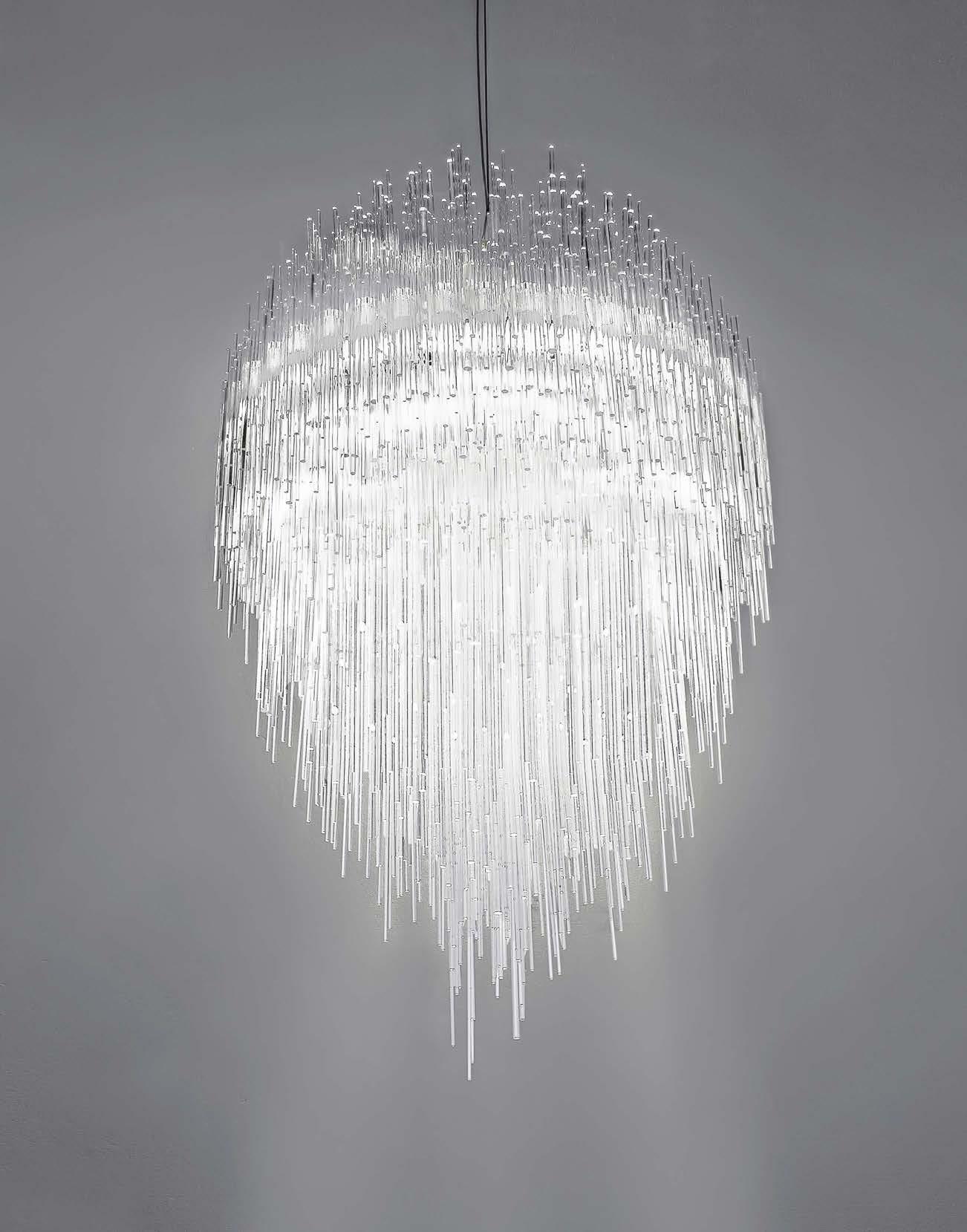 Inspired by the natural beauty of ice crystals, this new suspension light creates a spectacular, luminous piece through the use of over 4086 plexyglass tubes. Similar to light refracting through water, the illumination created by Iceberg is both brilliant and natural. Meticulously handcrafted, each light is a unique sculpture: sparkling, multifaceted, and powerful. Design Dodo Arslan.
