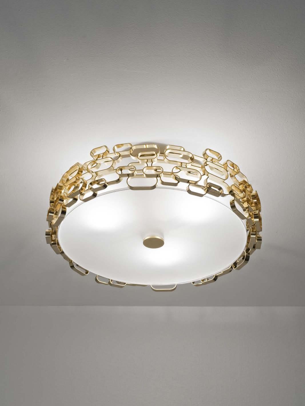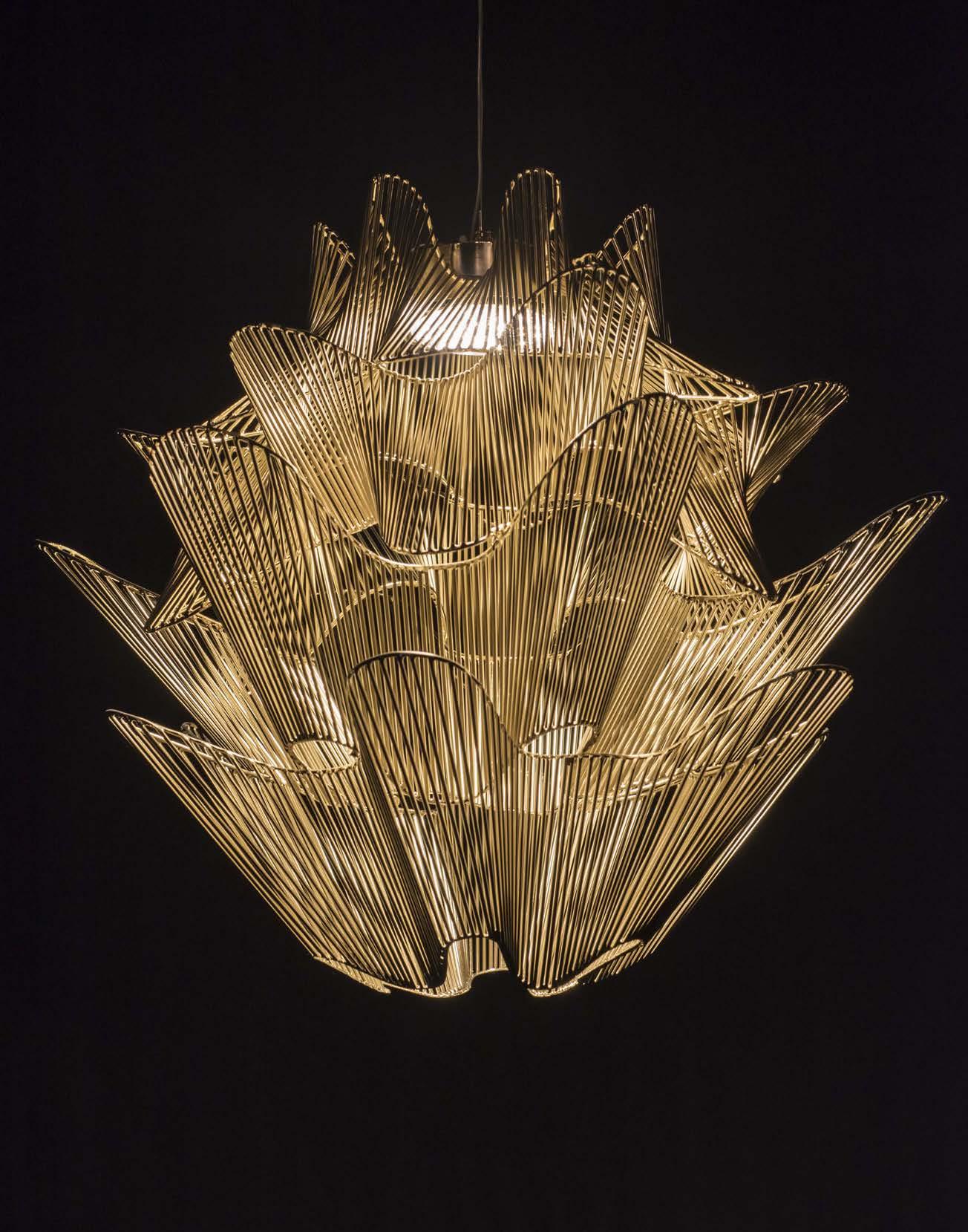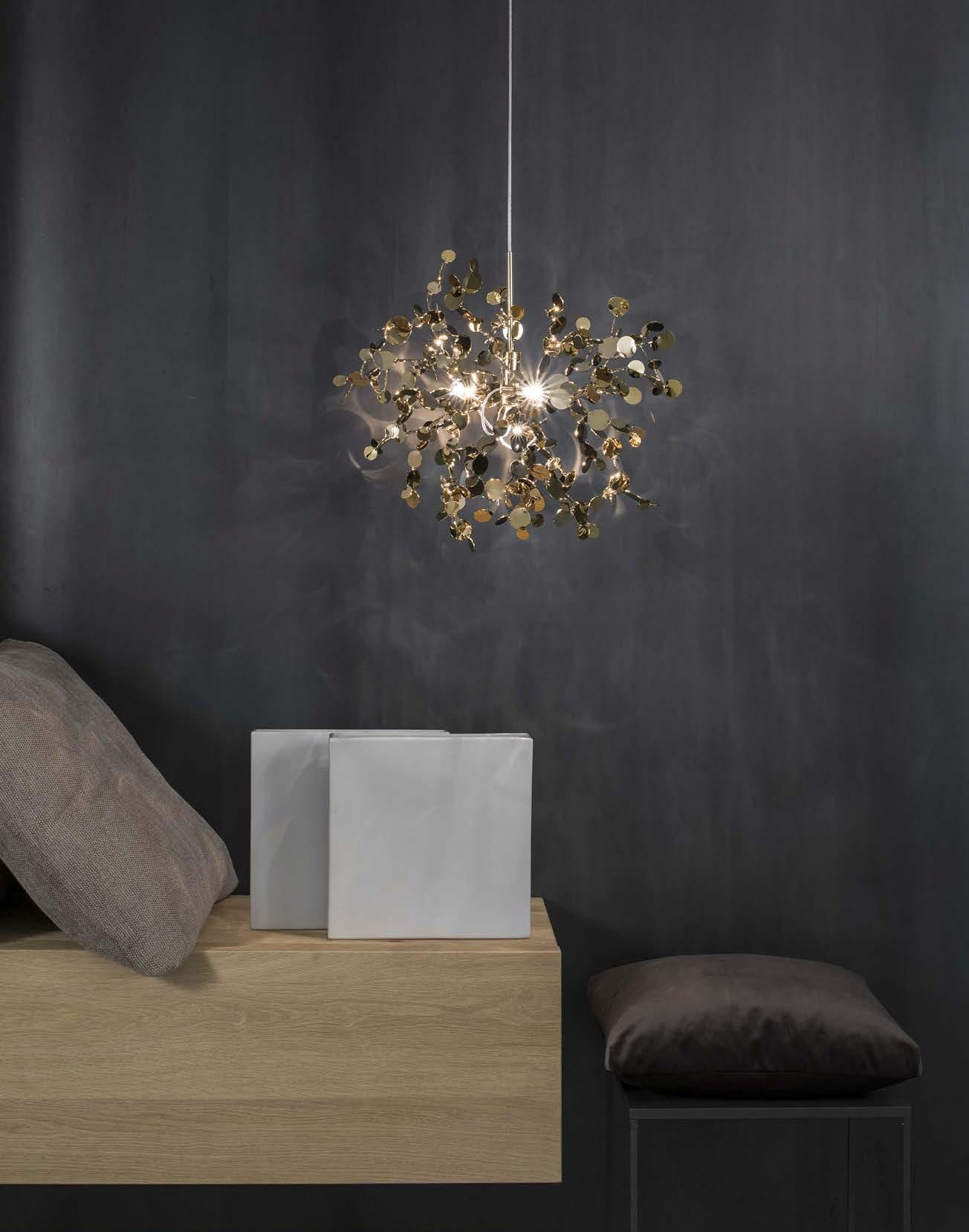 Recalling the natural beauty of a flower, Orten’zia’s hand-soldered “petals” emanate a unique glow, immersing the entire room in a glimmering light. An organic radiance is created through light and shadow, planting a garden within the room. Available in either nickel or gold plated, the Orten’zia’s elegant form complements its dramatic light. Design Bruno Rainaldi.