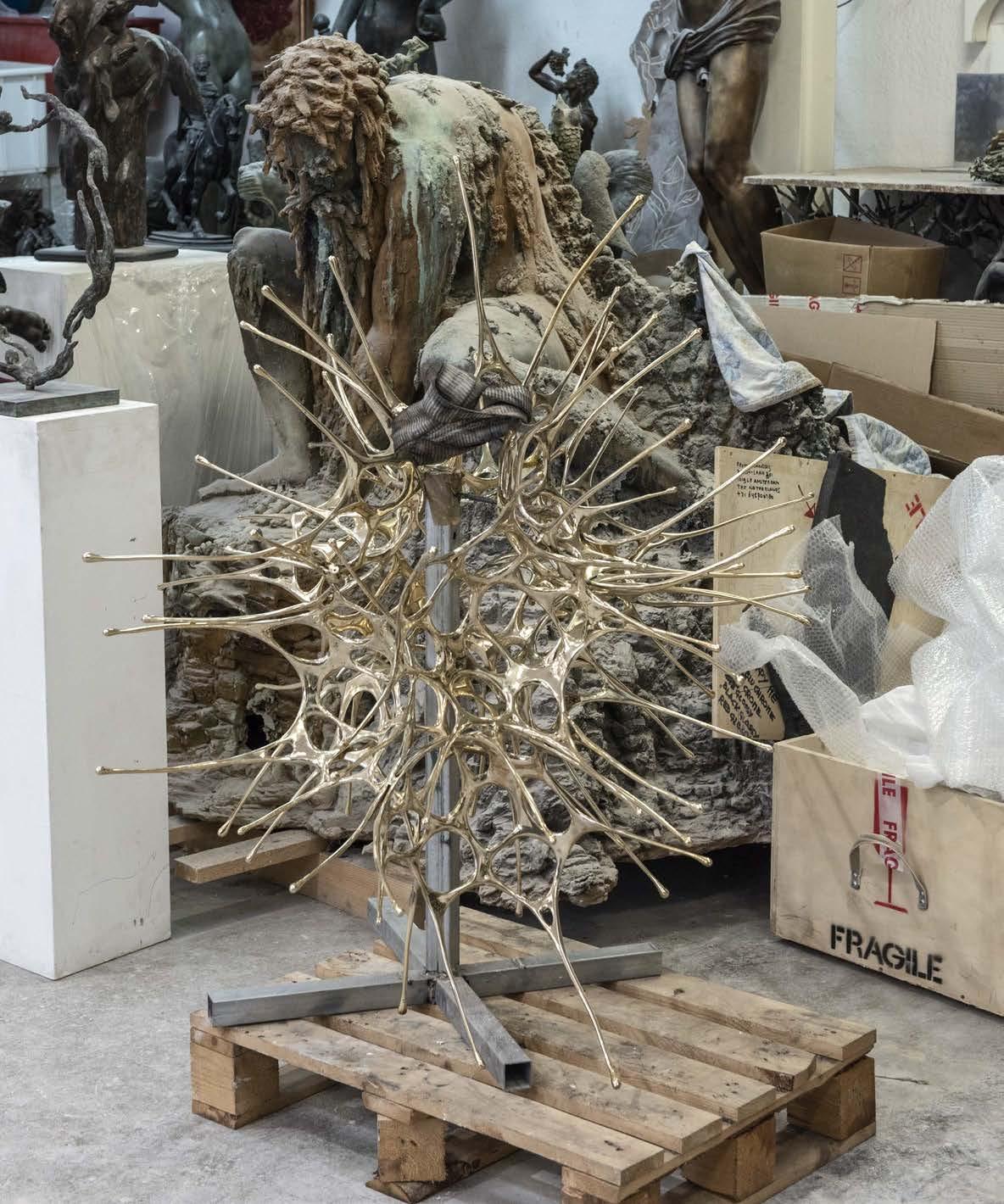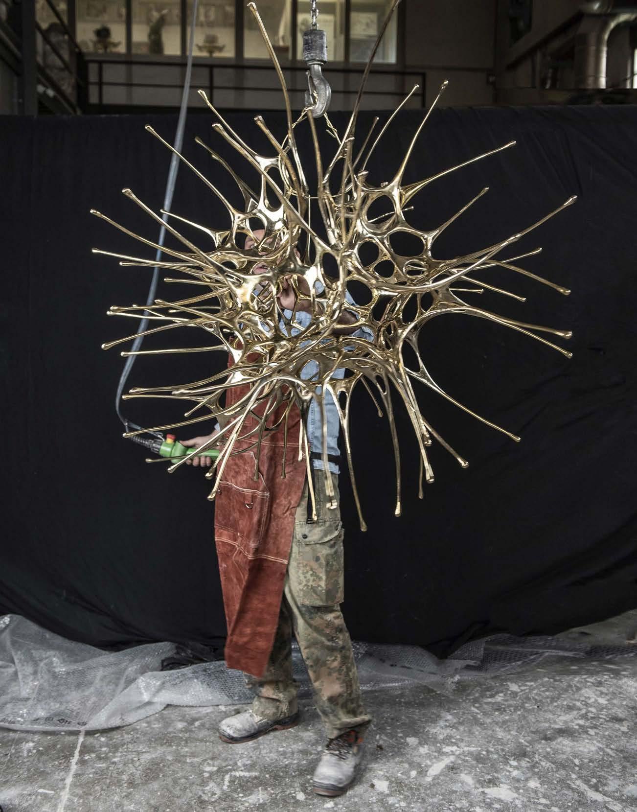 Dragon represents a new chapter for Terzani: the first piece designed as a standalone brass sculpture, cast at a historic foundry in Tuscany. At Terzani, our creative process benefits from the dialogue created between our history, our creative partners, and our innovative spirit. When creating Dragon, we found that the most powerful expression was not as a lighting design but as a sculptural work of art, one that elevates the artist and harnesses our creative expertise. In Chinese mythology, the dragon is a nature deity central to creation tales. Thus, it makes sense that the latest from designer Dodo Arslan tapped into this powerful, ancient symbolism for his newest creation. In a dramatic rethinking of how rooms are experienced, Dragon is a sculpture designed to not only grab attention but also change how a space is considered. An explosion of liquid metal, tamed by Terzani’s Tuscan master craftsmen, Dragon reflects the power of the fires that shaped it and speaks to the connection between earth and water. This handcrafted piece embodies the cyclical dance of the elements while evoking a cosmic harmony. Its presence unites not only a space but those who inhabit it. Each Dragon is a unique, fully customizable, and numbered sculpture. While it imparts the feeling of the natural, organic form, it is a painstakingly crafted piece of art and an ode to the fusion between the creative force of man and nature. Design Dodo Arslan.