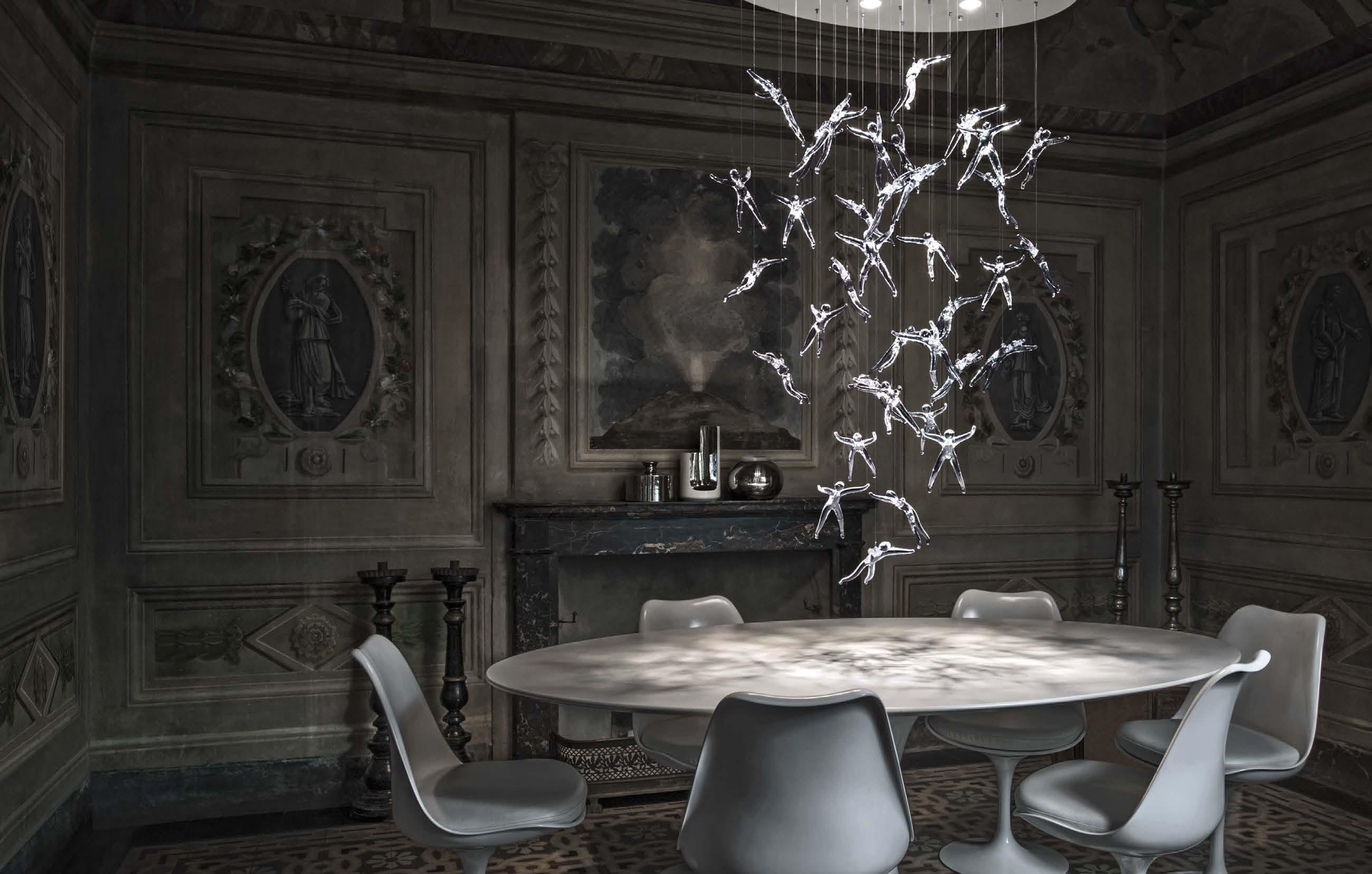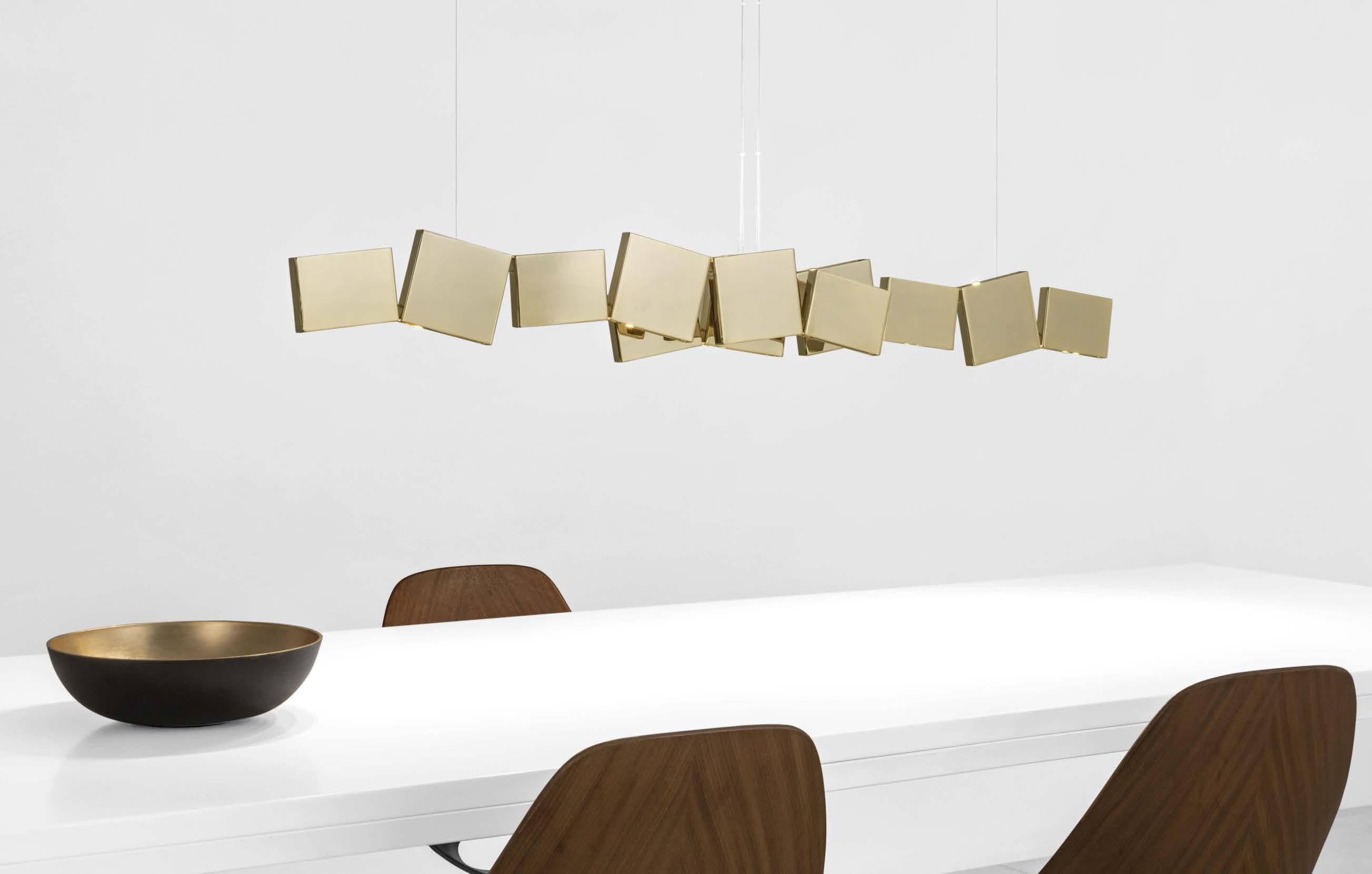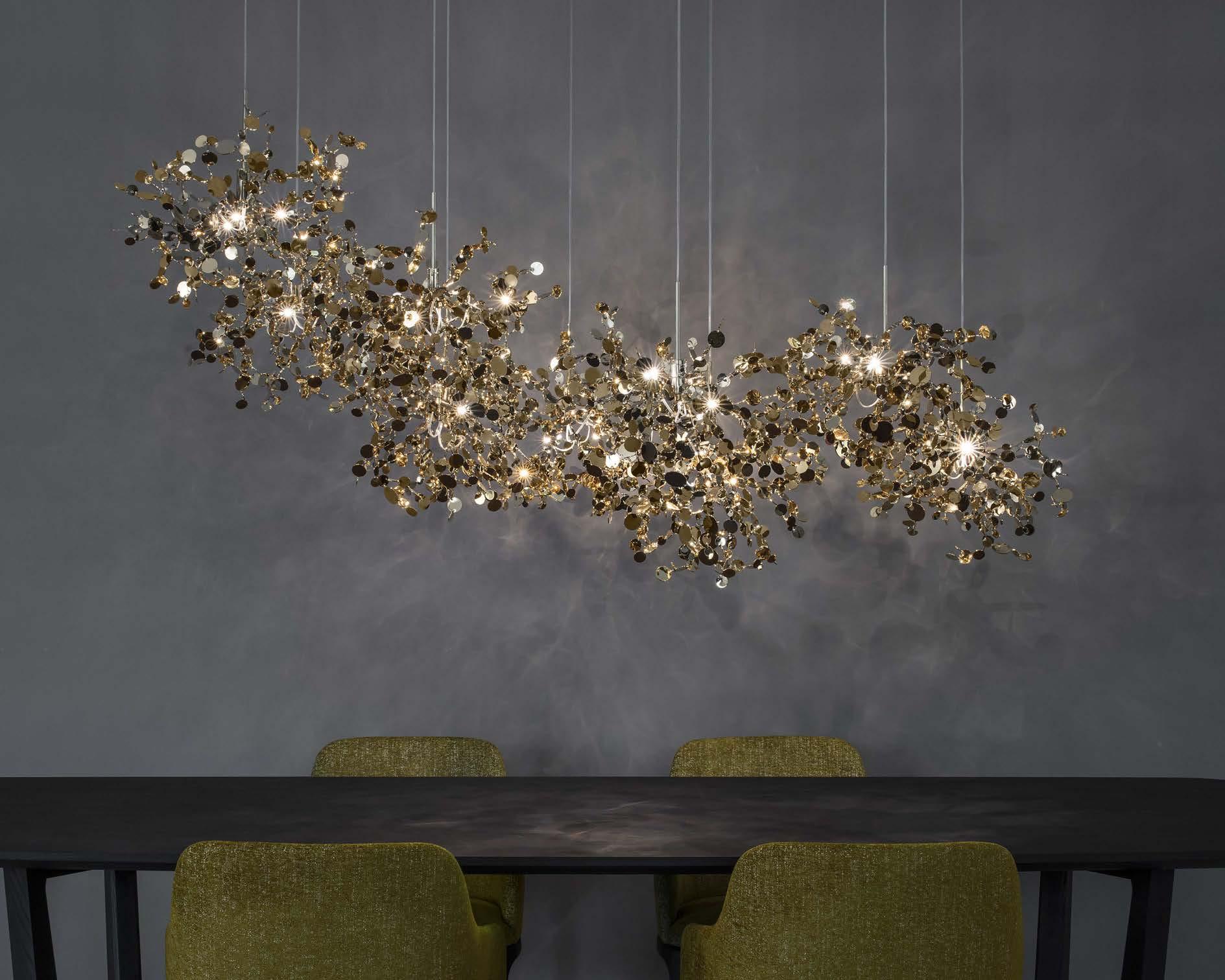A playful study of reflection, the idea for Anish was born when designer Dodo Arslan, while playing with his daughter, became fascinated by the almost infinite reflections spoons unleashed due to their concave and convex surfaces. Taking this idea to a larger scale, Dodo took inspiration from Italian flatware manufacturer Sambonet and created a pendant composed of a range of spoons, from the smallest teaspoon to serving spoons, which magnify the reflective quality of this shape. The result is an installation that creates a “galaxy” effect of seemingly endless light. Design Dodo Arslan.