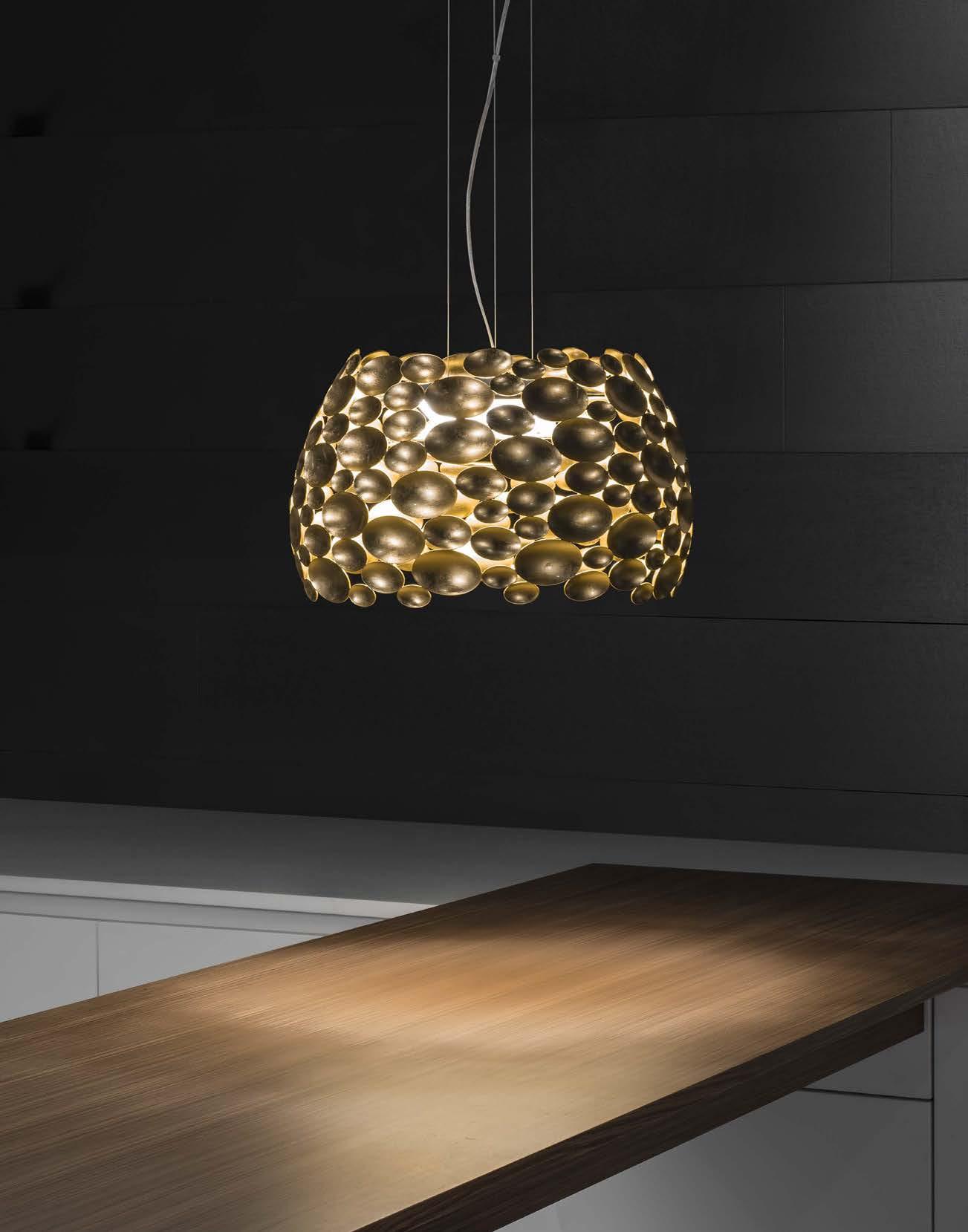 Core, designed by Christian Lava, is reminiscent of the natural energy at the heart of our world. Like bright lava seeping through the earth’s crust, vibrant spheres of faceted glass break through the iron surface of this pendant. Forcing light to pass through this metal structure results in a powerful, vibrant exchange of forces; light and shadow erupt across the room, and the led light pours through, as the light itself emits an organic radiance. Available in nickel, black nickel, and gold plated finishes. Design Christian Lava.