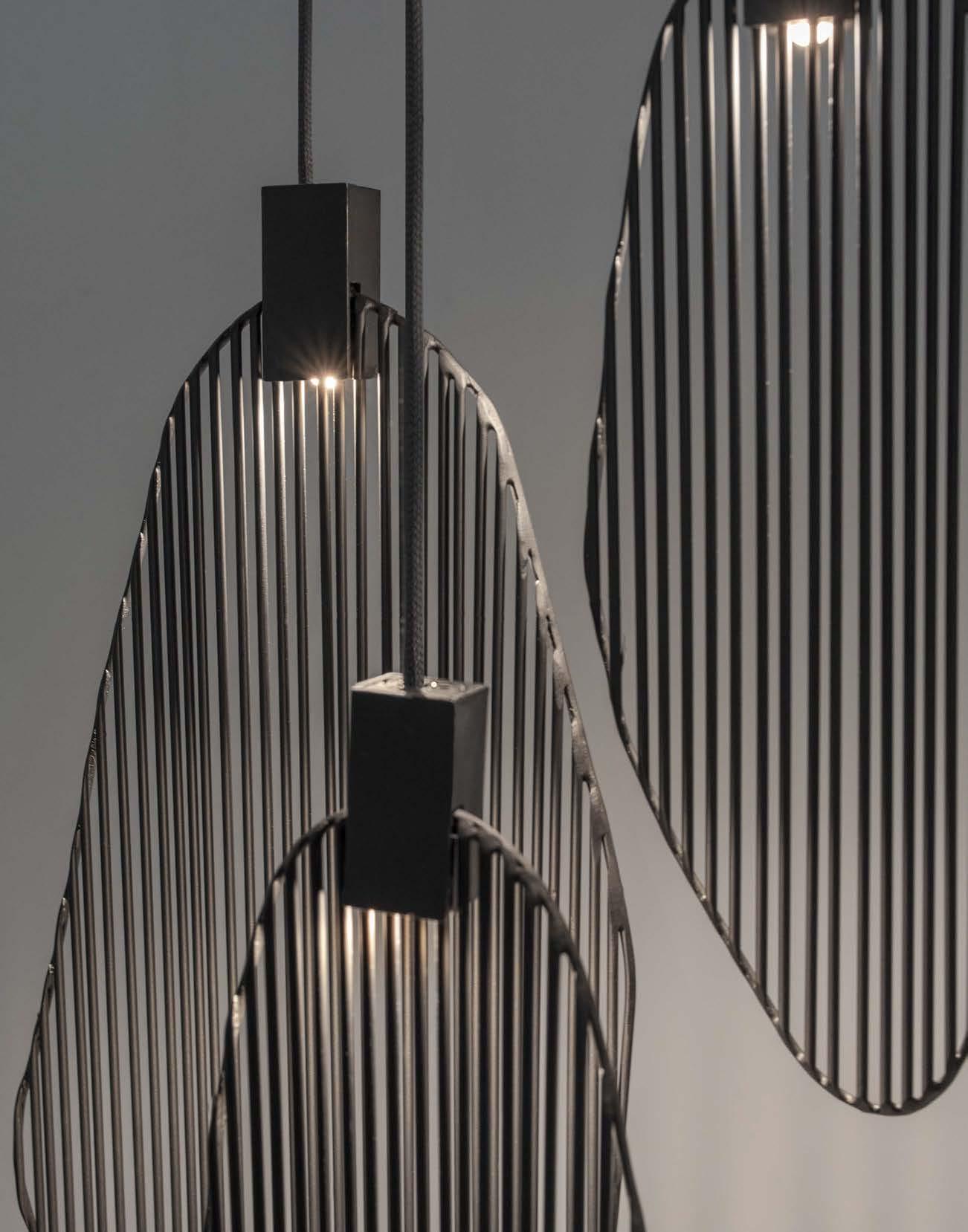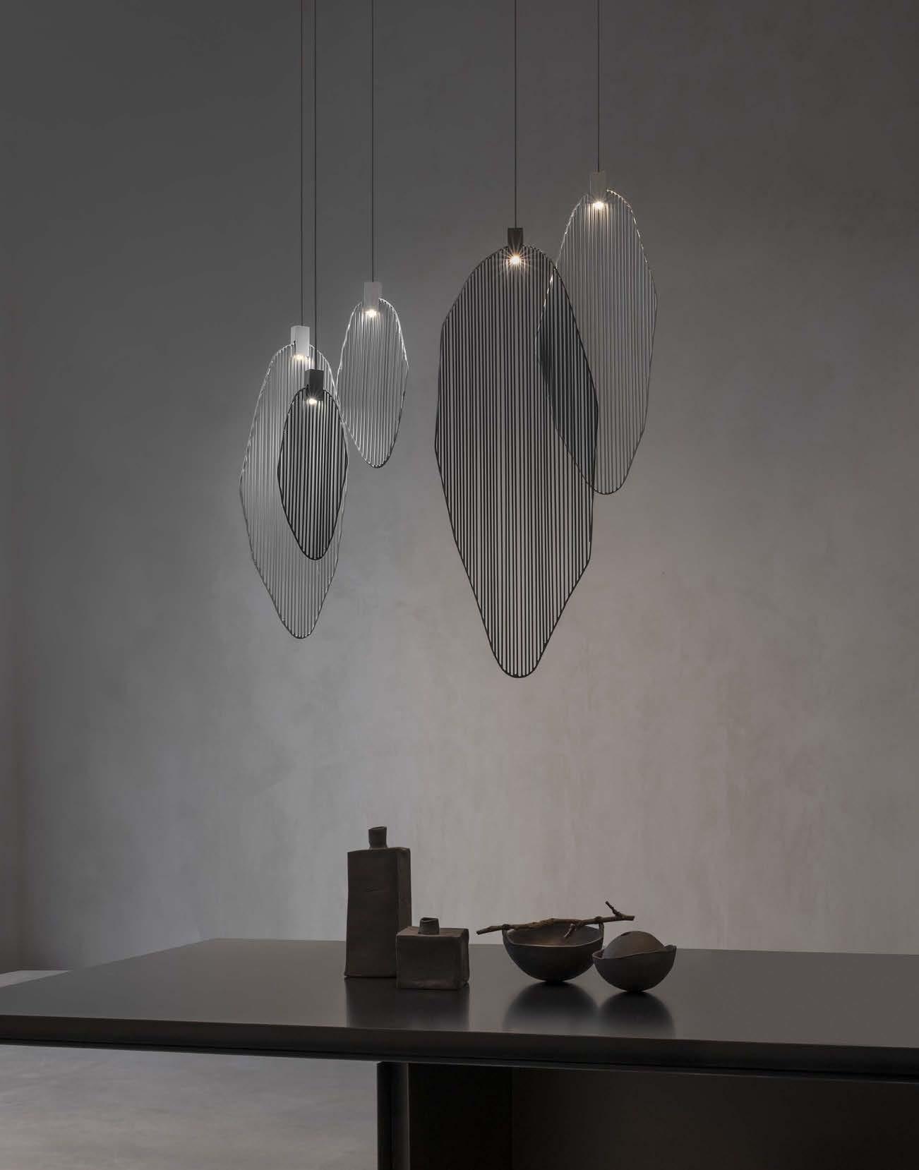 HThe new Harpe collection comes from the childhood memory of its designer, Christian Lava. Like most children, he would look up into the sky and visualize shapes in the clouds as they passed by. His active imagination would run wild with the fantastic things that emerged. One day, Christian looked up into the sky only to see a gray, leaden blanket of clouds. However, against this blank canvas, a break in the sky appeared, and bright sunlight came streaming down in rays reminiscent of a harp. It’s the memory of this divine instrument that inspired our latest pendant, Harpe. Made of metal, Harpe is available in three different shapes and sizes, and can be assembled in infinite combinations. Design Christian Lava.