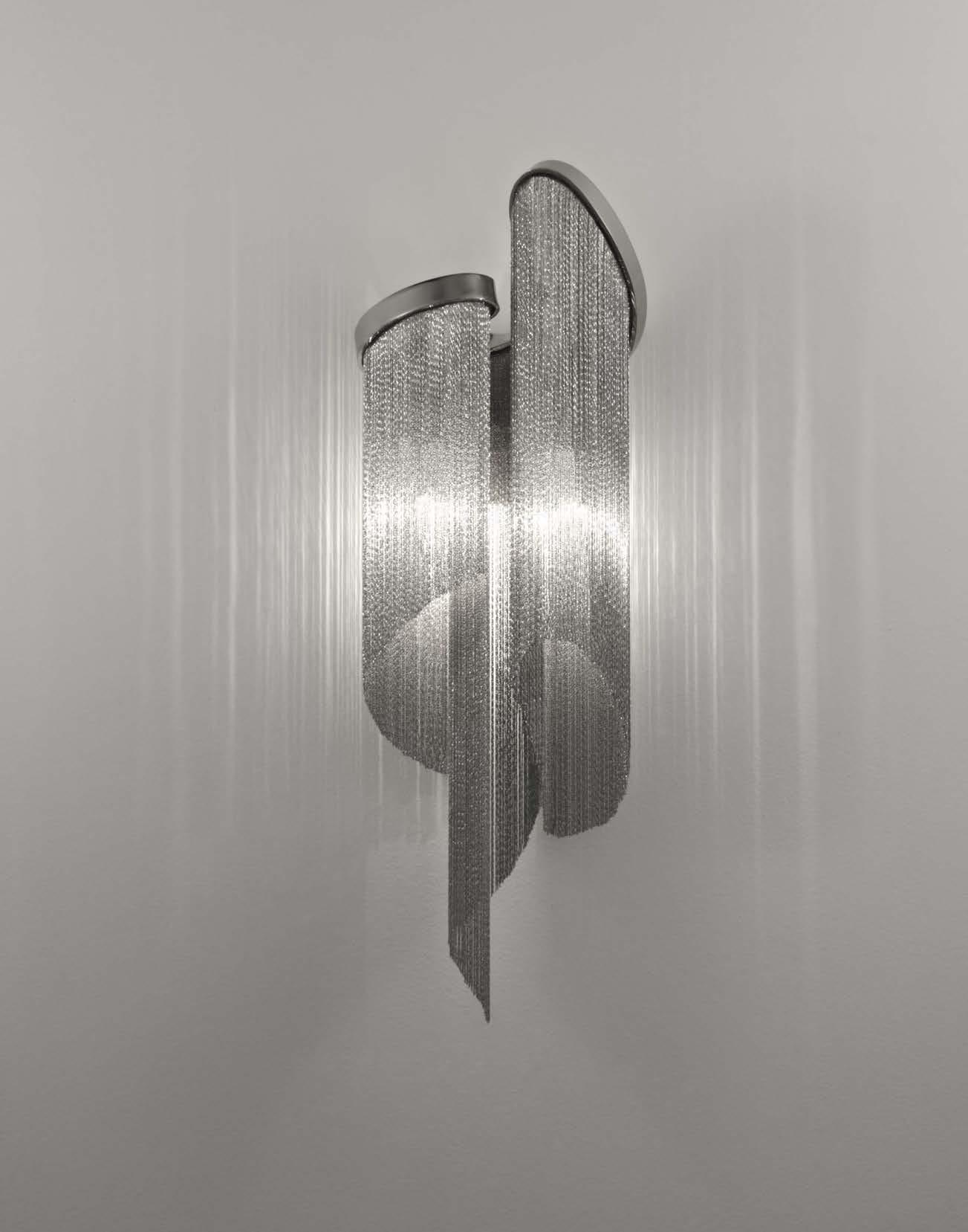 Another stunning design from Christian Lava, Stream is an impressive presence in any room. Like Christian’s other work for Terzani, Etoile, Stream’s design exploits the physical characteristics of the materials used to envelop a room in unique, immersive light. Here, over seven kilometers of metal chain appear to flow down from the undulating, plated frame. These cascading tiers project streaking, yet tranquil, shadows throughout the room. Design Christian Lava.