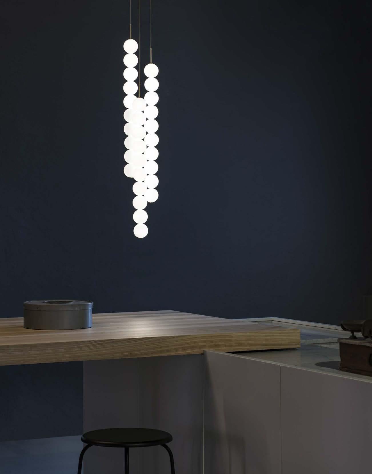 In the hands of Terzani’s craftsmen, we’ve turned this inspiration into a new collection of modular pendant lamps whose flexibility allows for complex and beautiful configurations. Each module, or strand, of Abacus is made of a custom set of round, hand-blown opal glass that emits a soft and uniform light. And, as the original abacus was used to calculate everything from simple addition to complex formulas, we’ve retained the same scalability. Due to its customization, our Abacus light is just as suitable in a home as in a commercial space, and its almost infinite configurations ensure you always find the right solution. Design Draw.