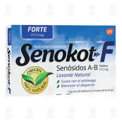 Laxante natural de origen vegetal, para el tratamiento de la constipación leve, provocada por malos hábitos alimentarios, falta de ejercicio e inadecuada ingesta de bra natural. Este laxante es particularmente útil en pacientes con constipación aguda, en pacientes geriátricos con malos hábitos de alimentación o músculos abdominales débiles. SENOKOT-F c/30 TABS. 17.2 MG.