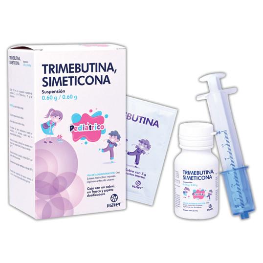 Fórmula: El sobre de 5g contiene: Trimebutina 0.60g. / El frasco con 26mL contiene: Simeticona 0.60g. (Cada 100 mL de suspensión reconstituida contienen 2g de Trimebutina y 2g de Simeticona).