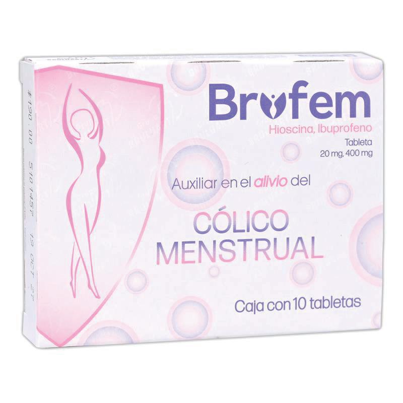 Antiespasmodico y Analgésico indicado para el pronto alivio de cólicos y dolores antes, durante y después de la menstruación. Cólicos biliares y de vías renales. BRUFEM c/10 TABS.