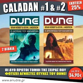 ΝΕΆ ΤΆΙΝΙΆ ΚΆΙ ΣΕΙΡΆ Δύο εβδομάδες νωρίτερα από το προγραμματισμένο θα δούμε στις μεγάλες οθόνες την πολυαναμενόμενη συνέχεια του επικού δημιουργήματος επιστημονικής φαντασίας του Denis Villeneuve, δηλαδή του Dune. Το δεύτερο μέρος της ταινίας ανακοινώθηκε πως θα βρίσκεται στις οθόνες των κινηματογράφων στις 3 Νοεμβρίου 2023, αντί για τις 17 Νοεμβρίου, που είχε αρχικά ανακοινωθεί. Υπομονή, λοιπόν, για ένα χρόνο παρά… κάτι ψιλά ακόμα, και ο αγαπημένος κόσμος του Dune θα βρίσκεται και πάλι κοντά μας! Στο αφιέρωμά μας «Προσεχώς − Οι ταινίες και σειρές που περιμένουμε το 2023» αυτού του τεύχους μπορείτε να διαβάσετε περισσότερα. Φυσικά, το έπος που σφράγισε την επιστημονική φαντασία είναι διαθέσιμο για να το παραγγείλετε και να το διαβάσετε από τις εκδόσεις Anubis εδώ: Οι φίλοι του Dune έχουν όμως κι έναν ακόμα λόγο για να αδημονούν, μια και το HBO Max ετοιμάζει τη νέα prequel σειρά “Dune: The Sisterhood” που θα διαδραματίζεται 10.000 χρόνια πριν από τα γεγονότα του Dune και θα είναι βασισμένη στο μυθιστόρημα Sisterhood of Dune των Brian Herbert και Kevin J. Anderson. Θα πρωταγωνιστούν οι Travis Fimmel, Emily Watson, Mark Strong και Shirley Henderson και η σειρά, τα γυρίσματα της οποίας ήδη ξεκίνησαν, δεν αναμένεται