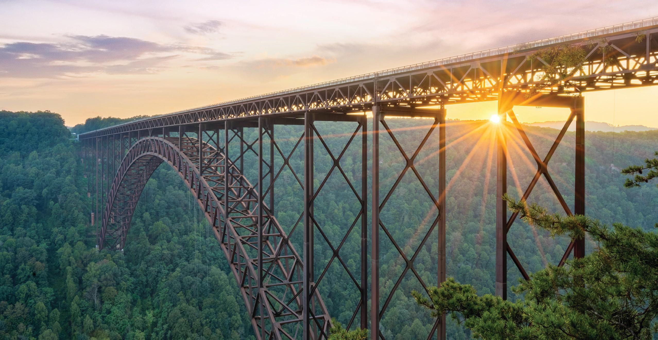 Mais ao sul, em Fayetteville, o New River Gorge National River é um rio poderoso que cruzou o planalto dos Apalaches, criando um magnífico desfiladeiro cercado por florestas densas e montanhas coloridas. O rio é conhecido por sua impressionante ponte de aço - a New River Gorge Bridge - que tem 924 metros de comprimento e oferece um contraste