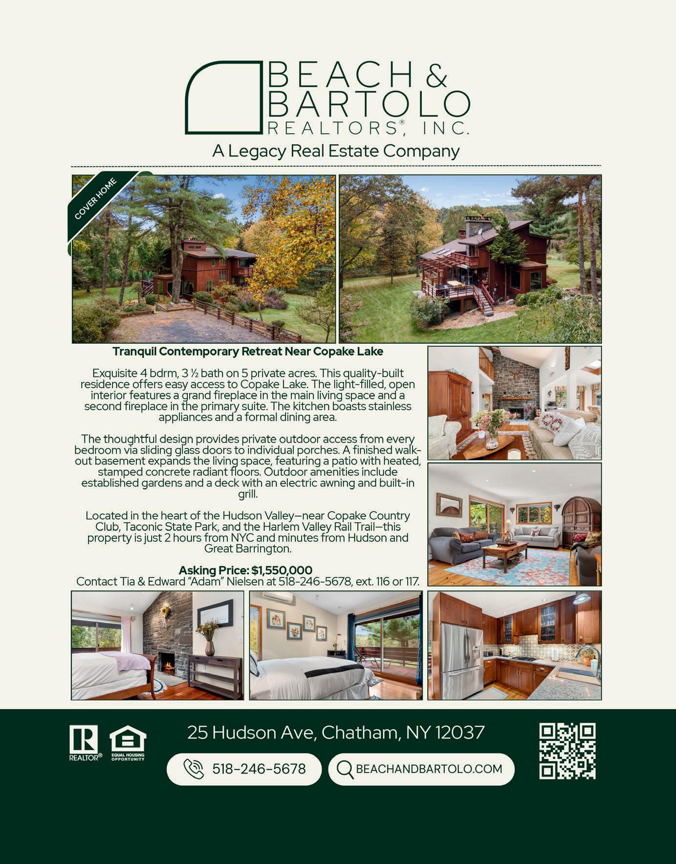 Tuckedbackfromaquietcountryroad,this spacious3bed,3bathhomeisprivately nestledonalmost14acreswithlovely gardens,majestictrees,rockoutcroppings, woodstoexploreandplentyofrollinglawn tokickthesoccerball,raisesomechickens, haveahorseorplantorfruittrees.Walkto theBartlettHouse,3mintotheTSP,and lessthan15minutestothethrivingc ityof HudsonandtheChathamvillage.