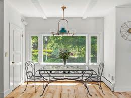 1836 Federal-Style Farmhouse This beautifully renovated farmhouse is rich with history. Set on over four acres with Willow Brook meandering through, this property offers a peaceful, storied setting with modern comfort throughout. Original wide board floors, exposed hardwood beams, and intricate molding and trim work highlight the home’s craftsmanship. The center hall layout leads to a stunning double parlor with two fireplaces and original pocket doors, as well as an open dining and living room boasting two additional fireplaces. The kitchen features a wood-burning fireplace, gas stove, island, walk-in pantry, and laundry room. Upstairs, you’ll find 3 bedrooms and 3 full bathrooms, as well as a room that could be used as a 4th bedroom. The exterior boasts classic clapboard siding, metal roof, original 6-over-6 windows, raised garden beds, a fenced backyard, and several vintage outbuildings.