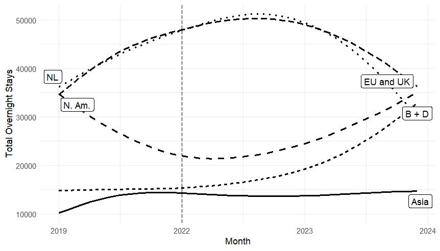 Applying the Hodrick-Prescott filter to our dataset, a method that identifies a smooth, long-term trend, we observed several patterns. Domestic business guests showed an increase from January 2019 to September 2022, followed by a decrease by December 2023. Business stays from other EU countries and the UK followed a similar pattern, with the exception of Belgium and Germany, which showed substantial growth. Visits from North America fully recovered, and Asia continued to grow (Figure 2):