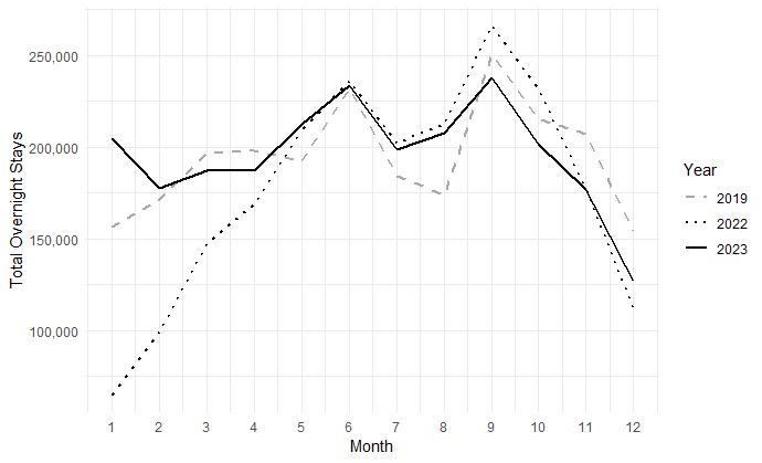 4. Preference for 3-Star Establishments: There’s a significant increase in total overnight stays in 3-star establishments, suggesting a change in accommodation preferences among business guests.