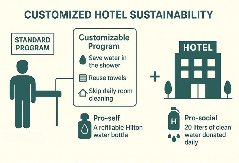 To address this, the study compared a standard sustainability program—where guests followed one fixed initiative (limiting showers to five minutes)—with a customisable program that allowed guests to choose among three actions: saving water, reusing towels, or skipping daily room cleaning. Two types of incentives were also tested: a pro-self incentive (a refillable Hilton water bottle) and a pro-social incentive (a donation of 20 litres of clean water per day to communities in need).