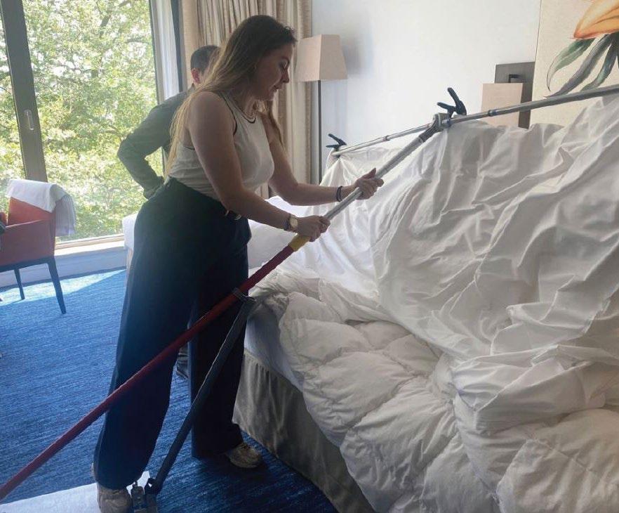 One of the most physically exhausting jobs in hospitality is housekeeping. Within this job, bed making is often pointed out as the most painful task. The task of making a bed exposes housekeepers to unhealthy positions for a long time. Ines Schneider, a master student from the Hotelschool The Hague has centered her thesis project around improving wellbeing for housekeepers during bed making operations. She built a tool called the DuvetLifter, based on the design work from Marilise Berrens from the TU Delft. This DuvetLifter suspends a duvet, thereby taking away the effort that housekeepers normally make when shaking a duvet in its cover. The tool was tested in the Hyatt Recency hotel in Amsterdam, where an experiment was set up where eight housekeepers were asked to make at least 10 beds with the DuvetLifter over the course of two weeks. Before using the tool, participants were asked to indicate their occupational pain and work stress. When using the tool, housekeepers adopted a healthier posture when changing duvet covers. This was noted both by the housekeepers themselves reporting lower pain, but also by the observing researcher. The master thesis work was written into an article together with Hotelschool researcher Klaas Koerten and Craig Webster. The article was published in 2025. For more information, find a publish article about this study here.