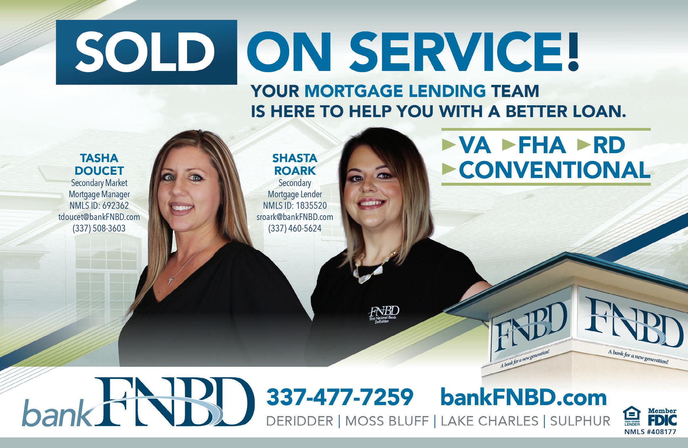 DERIDDER 1527 North Pine St. DeRidder, LA 70634 (337) 463-3638 395 East First St. DeRidder, LA 70634 (337) 462-0691 DERIDDER: Cade Marze (NMLS# 484125) • Mickey Atkinson (NMLS# 484123) Jim Merritt (NMLS# 566365) FORT POLK/LEESVILLE: Lawna Shapkoff (NMLS# 566371) • Jim Merritt (NMLS# 566365) Christine Olsteen (NMLS# 990149) • Kellie Anthony (NMLS # 566335) SULPHUR/HACKBERRY: Angie Franks (NMLS# 1226797) DEQUINCY: Lauren O’Neal (NMLS# 787030) www.sabinebank.com YOUR HOME TEAM SPECIALIST *MORTGAGE LOAN PRODUCTS: First Time Home Buyer Home Refinance FHA Loans VA Loans Rural Development Loans Member FDIC * subject to credit approval and qualified applicants MERRYVILLE 11479