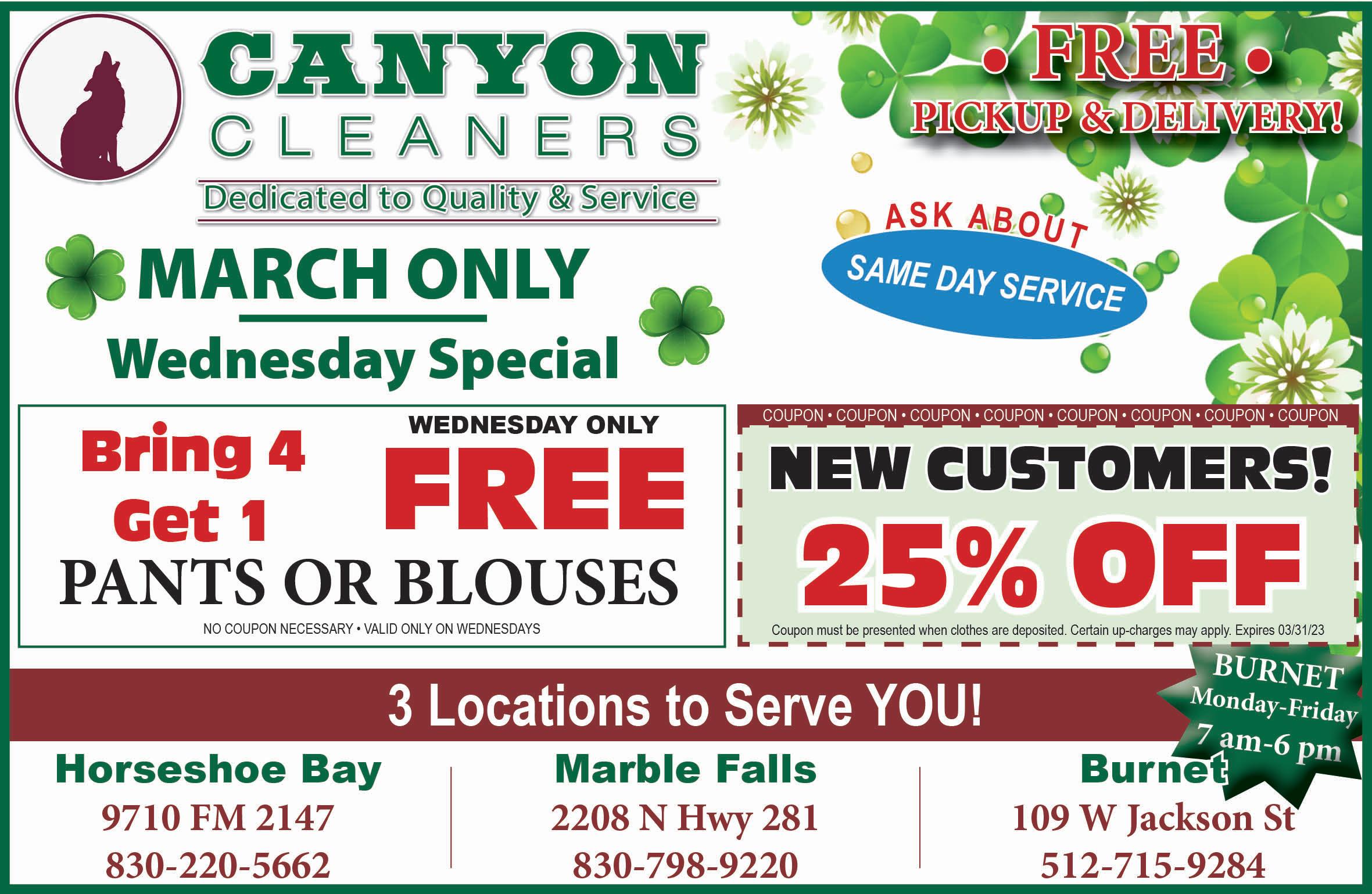 facebook@childrenshealthcenter 1009 Falls Parkway, Marble Falls (off Mormon Mill Road) 830.693.3988 chcmarblefalls.com OPEN Monday & Wednesday 8:00am - 5:00pm Tuesday & Thursday 8:00am - 4:00pm Friday 8:00am - 2:00pm SERVICES Well Child Exams • Immunizations • Developmental Testing Acute Care • ADHD • Behavioral and Mental Health CHILDREN'S Health Center PA Dedicated to Keeping Kids Healthy Healthcare from Birth to 21 years Sandra K. Thomas, M.D. Monday through Friday Himabindu Valmiki, M.D. Monday & Wednesday Jeanet Tannous, M.D. Tuesday & Thursday Flumist and Flu Shots available CHC follows the AAP and CDC guidelines for all immunizations. Pfizer, Moderna and Johnson & Johnson Vaccine Available for Anyone COVER Coughs & Sneezes STOP the SPREAD of GERMS & ILLNESS! L CKY hands are CLEAN hands! Limit one coupon per customer per visit. Coupon Expires 3/31/23. Any Natural Health Product Prescriptions & Sale Items Not Included 10 % OFF 701 3rd Street Marble Falls TX 78654 830-693-2972 www.atkinspharmacy.com Extended Store Hours: Mon-Fri 8am-7pm Sat 9am-4pm | Sun Closed 909 3rd & Main Street • Marble Falls, TX A little bit of New York in Marble Falls! (830) 693-0505 Expires 3-31-23. BUY A SANDWICH Check out our Daily Lunch Specials. Receive a FREE Drink and Cookie Hours: Mon.-Fri. 10:30am - 4:00pm Sat. 10:30am - 3:00pm WINTER SPECIAL 2108 C Hwy 281 • Marble Falls (In the Madylns shopping center) 830-637-7787 Mon-Fri 9am - 4pm • Saturday 8am - 2pm Breakfast Served • ALL Day EVERY Day and Always Gluten Free! We are Springing Forward to help you “Elevate Your Health”