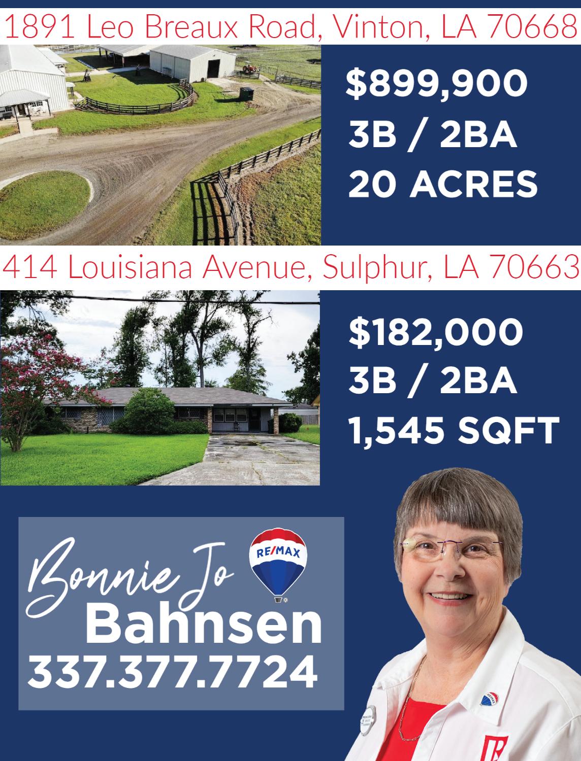 View All of Our Listings Online at www.inglesafari.com 765 BAYOU PINES EAST | LAKE CHARLES, LA 70601 | 337-478-1601 | Each office is independently owned and operated. Lake Charles & Sulphur | 337.478.1601 DeRidder | 337.463.2004 DAVID ROSE 337.884.2378 QUINNETTA SENEGAL 337.884.9577 HAYLIE OWENS 337.532.7083 TWILA MCFARLAND 337.912.9913 GLINDA MCGEE 225.573.7808 JANIS PAINTER 337.515.4519 MARTY PENA 337.274.6688 KAREN NORTHCUTT 337.499.9811 JESSICA SAVOY 337.764.6475 DANA TURPIN 337.485.0244 TARA WILLIAMS 757.831.6742 DANIELLE WYBLE 337.936.9889 JAMES ROMERO 337.853.6501 JARED PIERROTTI 337.317.7090 EJ WASHINGTON 337.532.7740 DOMINICK VALENTI 337.884.2818 CRYSTAL DOWNS MILLER 337.499.6577 KAYSHA SIMS 337.842.3008 JOSHUA RANDEL 337.515.6942 PAT MONTALBANO 337.802.8811 NIKKI MIXON 337.513.6928 ASHLEY REEVES 337.842.7711 ANJA RICHARD 337.274.2520 DIANE STEWART 337.304.1813 JO SMITH 337.302.0724 ROCKY KEELEY 337.540.2614 DREW LEBLANC 337.304.7211 JESS LAFLEUR 337.707.8609 SHAMS QUADIR 337.794.0086 ROGER WILLIAMS 337.884.8397 NATHAN ROSE 337.661.9903 WESTON WEBB 337.309.8133 RANDY LANTIER 337.936.2136 CAROLYN WELCH 337.563.3267 MICKEY MATTHEWS-CONRAD 281.299.9778 4 OCTOBER 2022HOME FINDER’S GUIDE