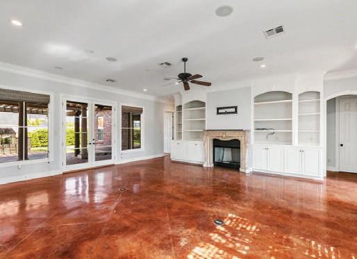 and spacious family room with gas fireplace and custom built-ins. Gourmet kitchen features abundance of