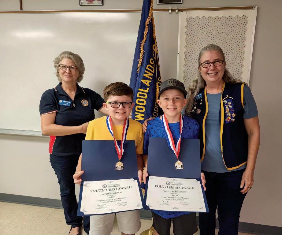 Dillon and Nicholas Federico, two elementary school-age brothers in Conroe, have been honored by the American Legion Auxiliary - Unit 305, with the Youth Hero Award. The brothers’ quick-thinking actions saved the life of a four-year-old child on Saturday, October 23, 2021.