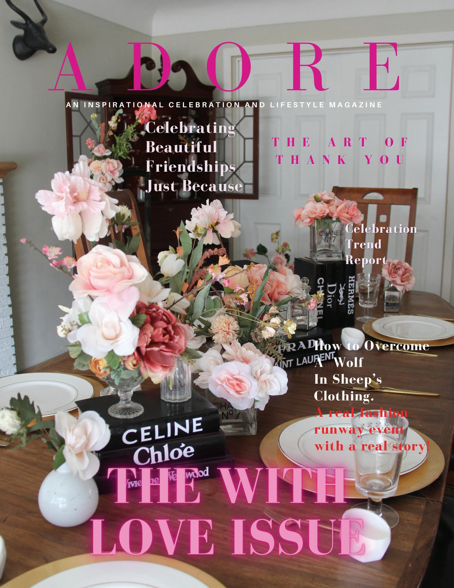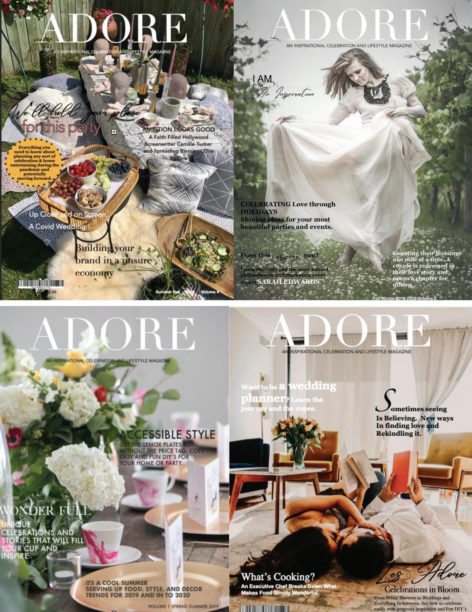 No Portion May be duplicated in whole or in part without the written consent of the publisher. Every effort has been made to ensure the accuracy of the information contained in this publication. However, the publisher assumes no responsibility for accuracy of information or omissions from the material provided. Adore Magazine cannot be held liable for the quality or performance of goods and services rendered by the advertisers published in the magazine. If you have questions or info please contact helloadoremagazine@gmail.com