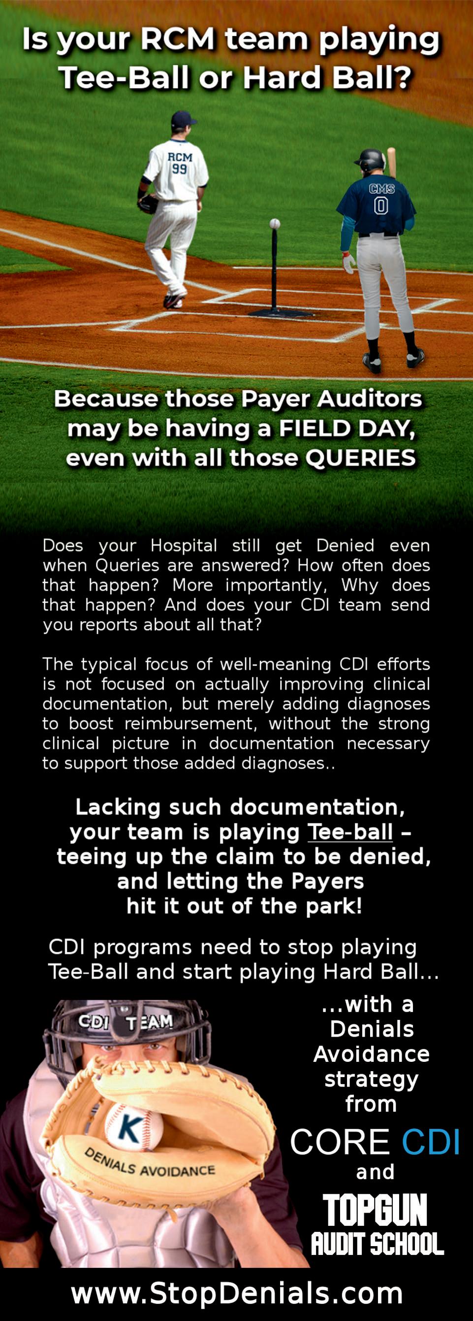 Every employee involved in the revenue cycle plays a vital role in driving down often self-inflicted payer denials by embracing a mindset of “Denials Avoidance,” embracing the notion that one avoidable denial is one too many. While no one role in the revenue cycle is more important than the other, let’s spotlight the critical role of Coding and Clinical Documentation Integrity. Clinical Documentation Integrity Specialists’ roles and responsibilities include concurrent review of medical records, identification of opportunities for physician documentation clarification, issuing of physician queries when clinically warranted, tracking of physician queries, and physician education on documentation improvement. CDI program popularity and their implementation in hospitals really took off around 2008 with the advent of the MS-DRG reimbursement system. CDI consulting companies promoted to CFOs that implementing their CDI programs were the answer to increasing reimbursement with the capture of more CCs/MCCs. This message still prevails but has been expanded to include Risk of Mortality/Severity of Illness scores and other quality measures that factor into publicly reported quality scores. One would assume that Clinical Documentation Integrity Programs would alleviate payer denials through better