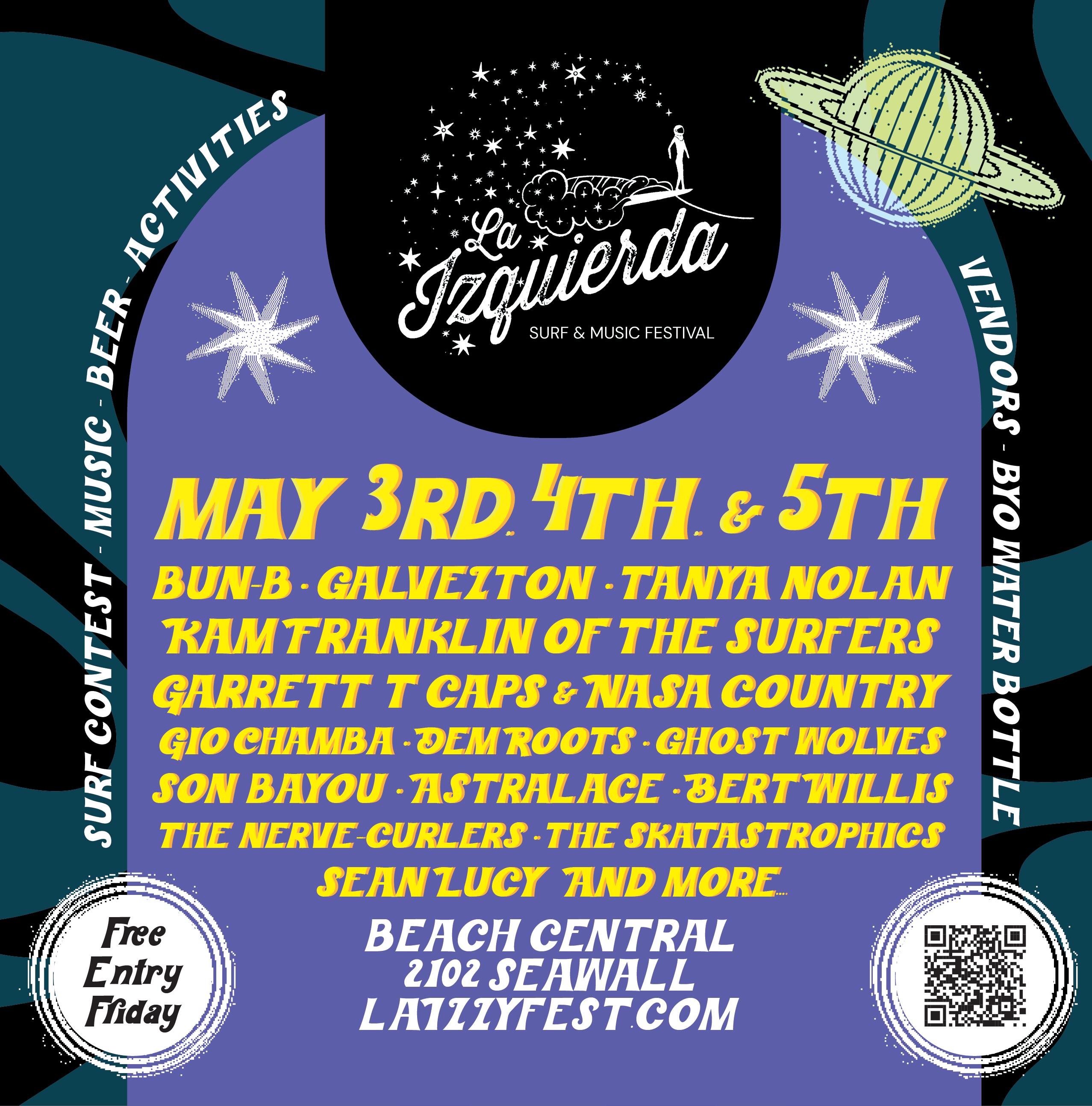 MARK YOUR MAY THE 4TH WEEKEND FOR LA IZQUIERDA SURF AND MUSIC FEST, AKA LA IZZY FEST, MAKING ITS GRAND RETURN TO BEACH CENTRAL, GALVESTON, TX, THIS MAY 3RD-5TH. A stellar lineup of musical guests bring a constellation of the different genres and sounds of the third coast while the waves sport surfers competing for prizes in longboarding and SUP.