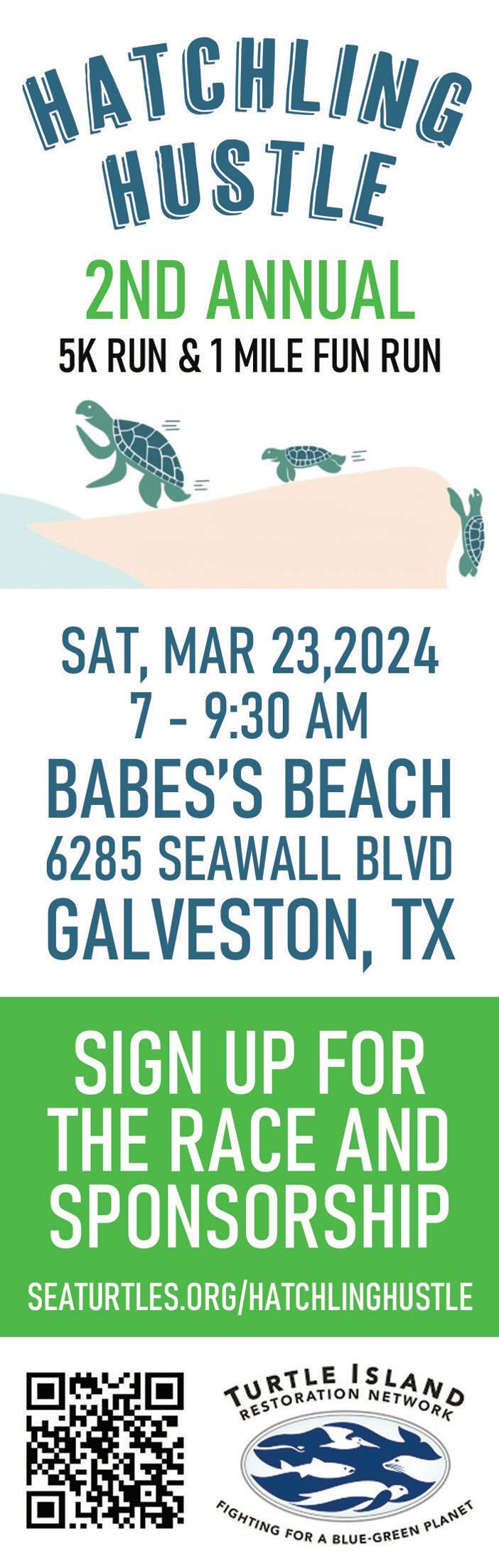 TURTLE ISLAND RESTORATION NETWORK (TIRN) IS HOSTING THE 2ND ANNUAL HATCHLING HUSTLE ON GALVESTON ISLAND. The Hatchling Hustle is a 5K run and 1 mile fun run on the Babe’s Beach, 6285 Seawall, Galveston, Texas between 61st Street Fishing Pier and Galveston Fishing Pier. This year, the event will occur on Saturday, March 23rd, 2024 from 7 to 9:30 a.m.
