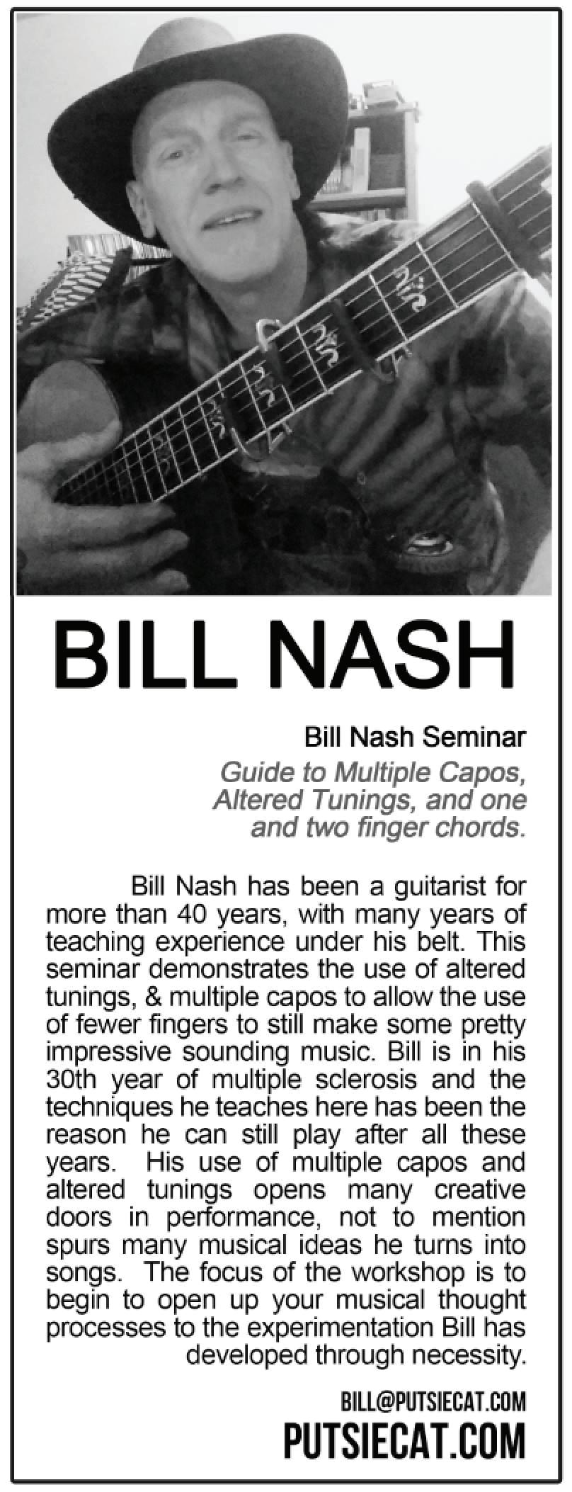 Presented by Bill Nash. This workshop is about expanding musical possibilities on the guitar – have you ever felt limited by having to play in standard tuning all the time (ie: hard chord fingerings, etc)? You hear other people using altered tunings and multiple capos and it sounds so good... well this workshop will introduce you to the magical world of multiple 3 string capos with altered tunings! The focus of the workshop is to begin to open up your musical thought processes to experimentation... Bill will show you his process for using altered tunings and capo schemes to produce very colorful guitar sounds that used to be only possible with three and four finger chords, now with just one and two fingers! There will be a packet of charts available of preferred places to put the 3 string capo in all altered tunings for students who attend.