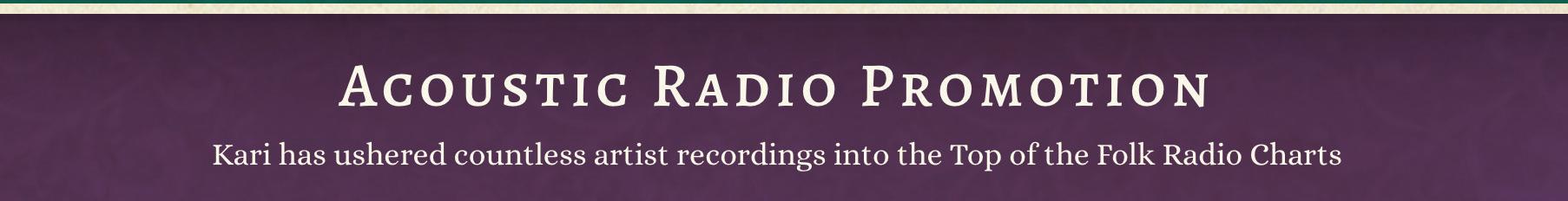 www. kariestrin .com Photo by Kari Bedford / Graphic Design by Vanessa Lively SOME UPCOMING FALL RELEASES: �e Kennedys - HEADWINDS | Hank Woji - HIGHWAYS, GAMBLERS & DEVILS & DREAMS Christian Parker - SWEETHEARTS (Byrds tribute) | Tom Paxton & John McCutcheon - TOGETHER Tret Fure - LAVENDAR MOONSHINE 18 NO. 1 CDS AND 66 TOP 10 RELEASES IN 2021/2022/2023! No. 1 CD - JAN. 2023 UPSTATE CROSSROADS Tim Ball No. 2 CD - MARCH 2023 THE LITTLE IN-BETWEEN Tim Grimm No. 1 CD - APRIL 2023 BETWEEN HELLO & GOODBYE Greg Greenway No. 1 CD - MARCH 2023 NINE APPLES OF GOLD Karan Casey No. 1 CD - MAY 2023 GETTIN’ TOGETHER Michael Jerome Browne No. 3 CD - MAY 2023 SKYLARK Open Road No. 2 CD - JUNE 2023 SEVEN STONES Katie Dahl No. 5 CD - FEB. 2023 LOVE HOPE TRUST Roger Friedman No. 5 CD - JAN. 2023 TIMELESS SPACE �e Heart Collectors No. 3 CD - JAN. 2023 HOW CAN I SAY THIS? Annie Capps
