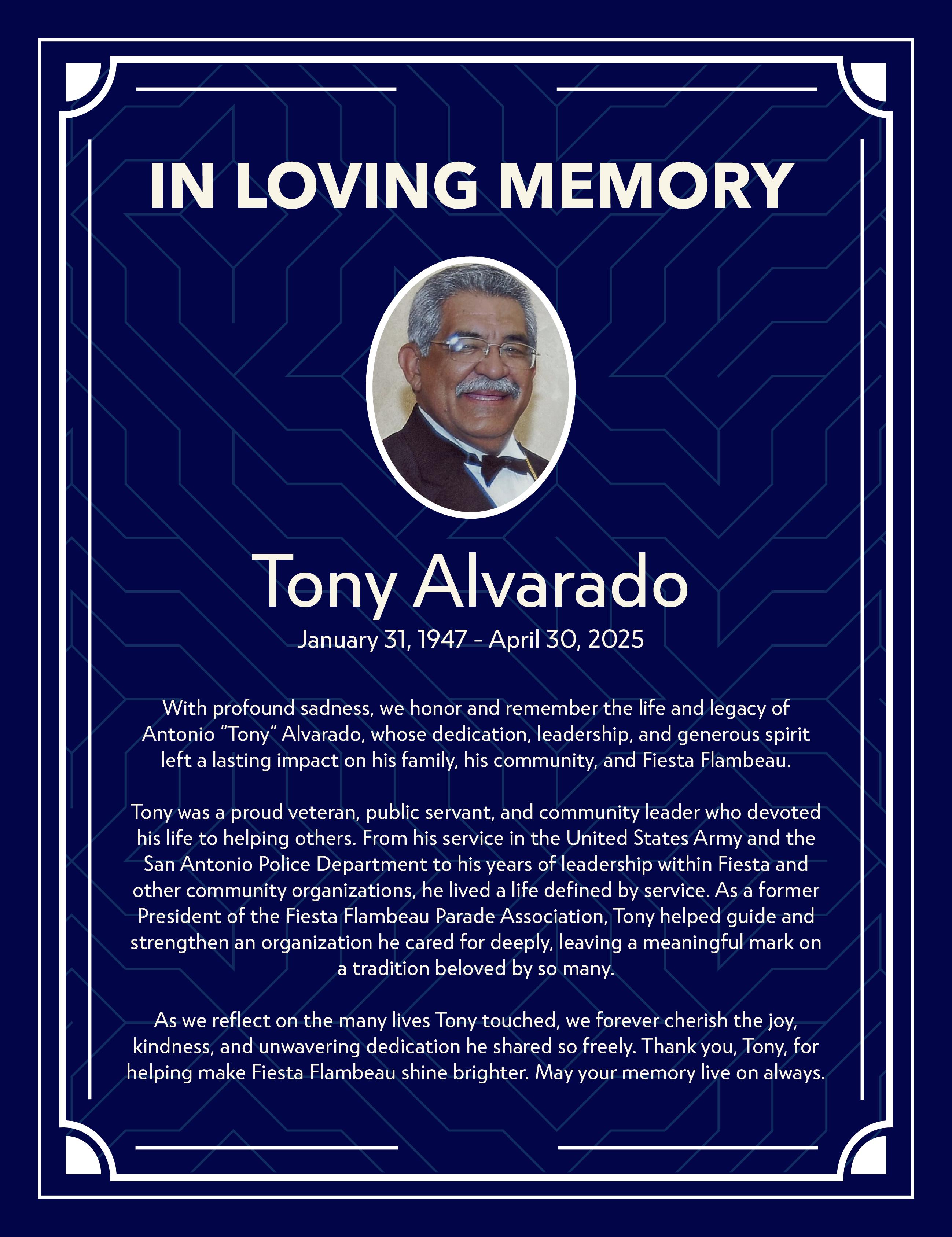 I want to extend my sincere appreciation to the Fiesta Flambeau Parade Association and sponsors along with our volunteers, parade participants, and local military for making this year’s Flambeau Night Parade possible. Your dedication is crucial to preserving this beloved celebration and our city’s spirit.