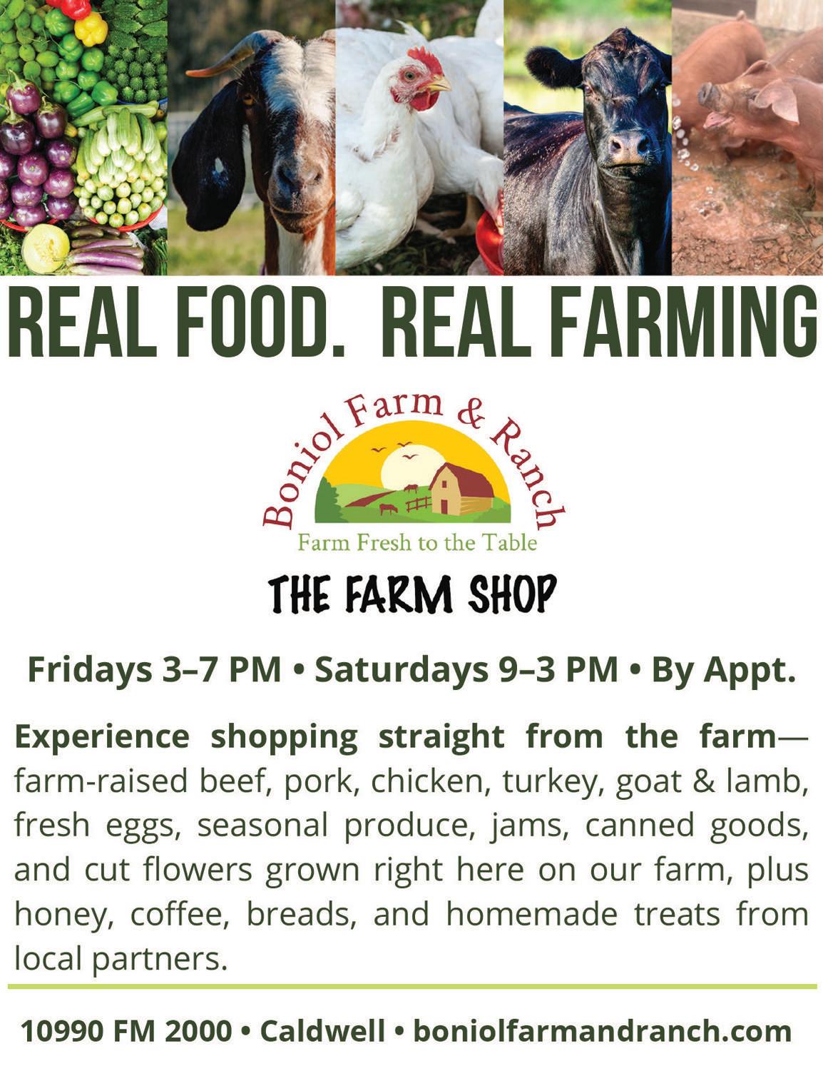 Boniol Farm & Ranch raises and grows pork, chicken, turkey, lamb, goat, fresh eggs, seasonal produce, jams, canned goods, tallow, lard, homemade treats, and cut flowers, all produced directly on the farm with careful attention to quality. To complement these offerings, the farm collaborates with local partners to provide raw honey, coffee, fresh breads, additional treats, and premium Angus/Wagyu beef, creating a well-rounded shopping experience.