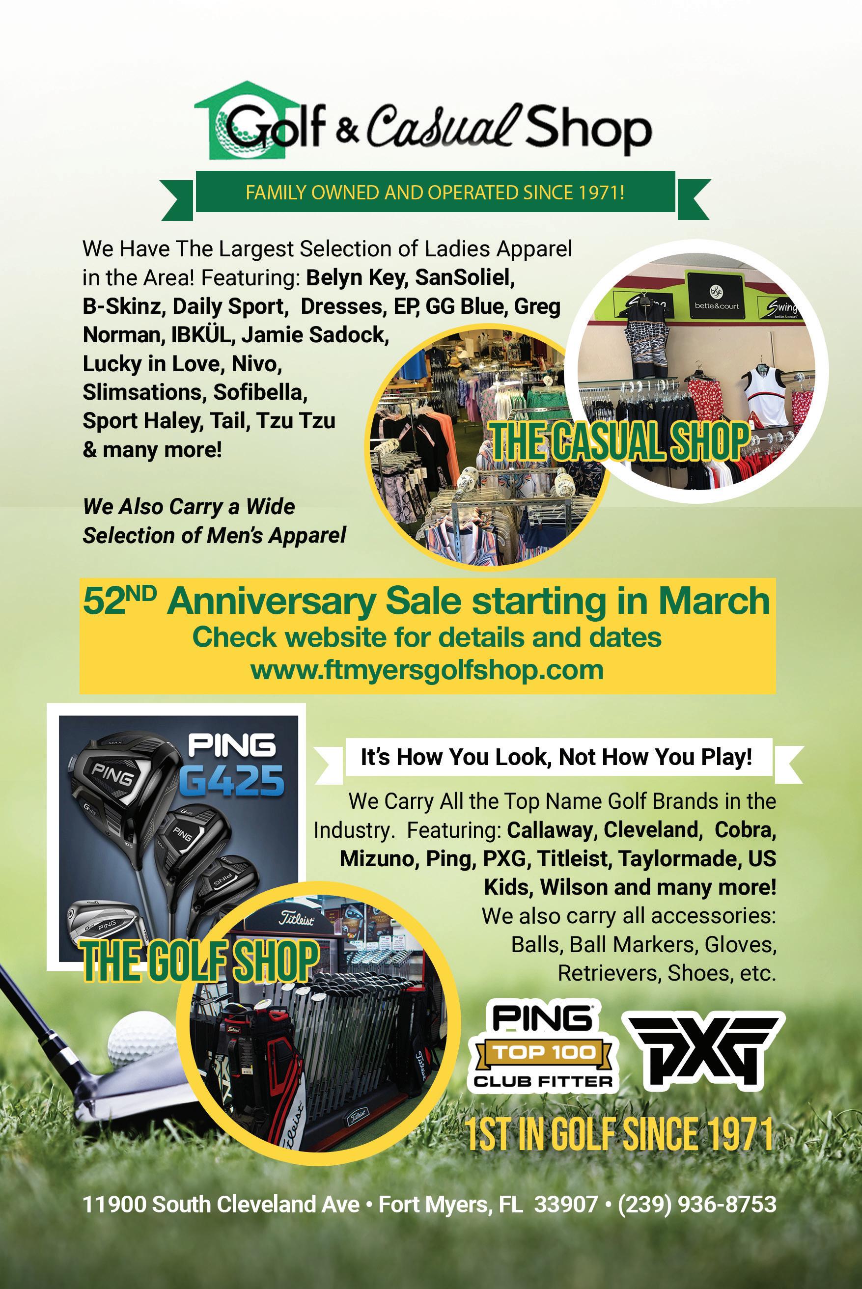 GET FIT BY OUR EXPERTS FOR FREE!! UTILIZING THE BEST FITTING TECHNOLOGY IN THE RETAIL GOLF INDUSTRY! • BALL FLIGHT, FULL SWING TECHNOLOGY • CERTIFIED FITTING EXPERTS • DATA TO HELP IMPROVE YOUR GAME • COMPLETE SET CUSTOMIZATION Fort Myers • 11120 S Cleveland Ave • (239) 939-5235 Palm Harbor • 32257 US Highway 19 North • (727) 787-3370 visit us online at worldwidegolfshops.com THE MORE YOU SPEND, THE MORE YOU EARN! START EARNING TODAY! SCAN HERE TO SIGN UP GET 2% BACK ON ALL PURCHASES!* *Excludes PING Purchases EXPERTS + TECHNOLOGY = THE PERFECT FIT