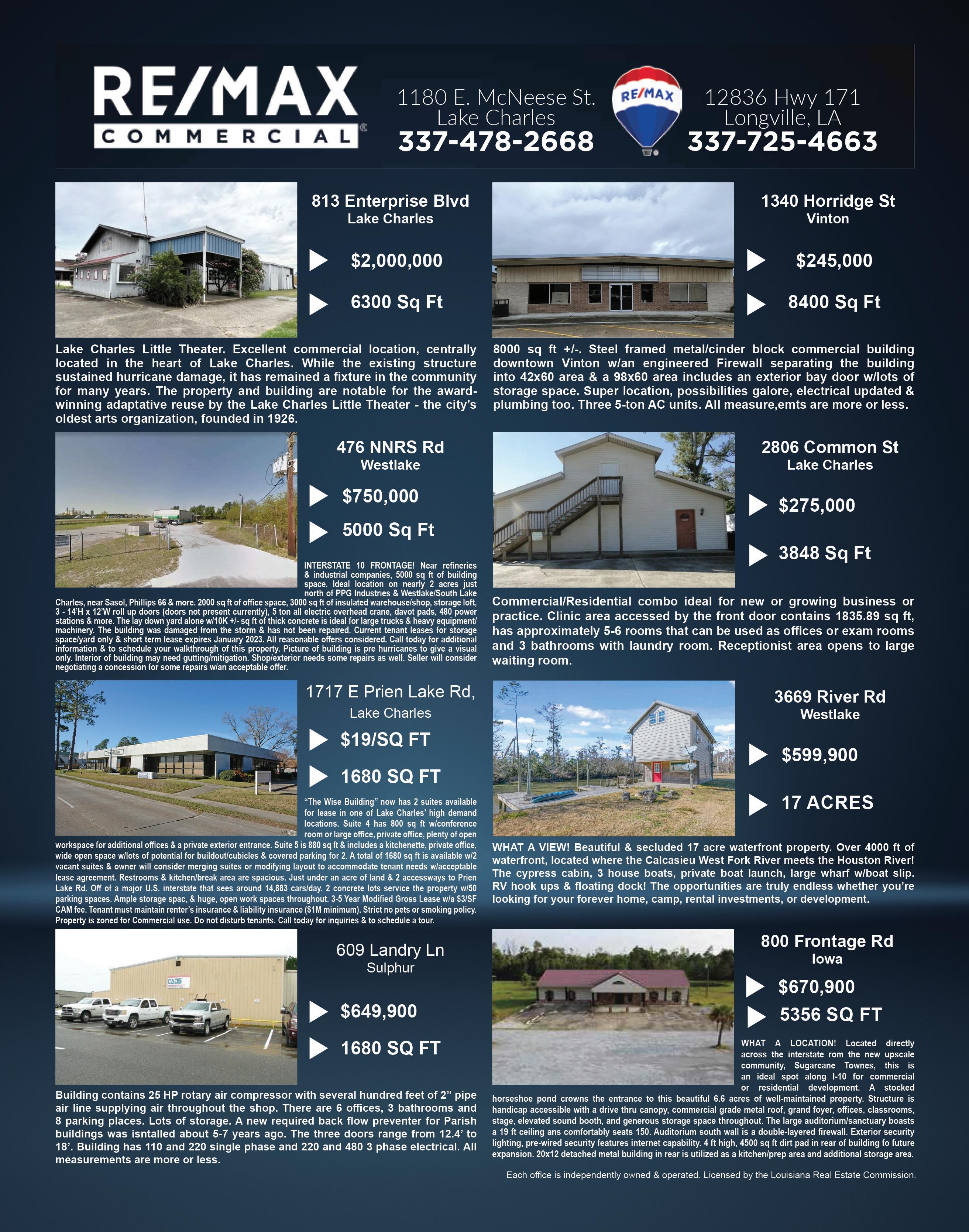 JEFF PITRE REALTOR® 337-540-3334 $1,152,800 2.7 ACRES of Prime Commercial Property on busy corridor of Westlake. Endless Possibilities – High Traffic Count. 337-855-7062 • 888-855-7062 www.realtymm.com REALTY YRTIS MUELLER M $369,000 PRIME COMMERCIAL PROPERTY just north of Phils Lane. Partially cleared, zoned Commercial and Agricultural, great location, 280 ft. on Highway 171. LOUIS SELLERS Broker 337-884-7705 $307,363 PRIME COMMERCIAL located on Davis Rd. Property has been maintained. High traffic. Great for retail, mall or apartments. $990,000 / $425,000 PRIME COMMERCIAL PROPERTY Own a piece of Moss bluff with either of these 2 tracts between Popeye’s and Dynamic Dimensions access to Sam Houston Jones Pkwy. or Tom Redd Ln. Owner/Agent $449,900 - 2,986 LIVING, 4 BR, 3.5 BA 1.5 STORY updated french home on corner lot in restricted St. James Subdivision. Custom kitchen with granite countertops, stainless appliances, snack bar and breakfast area, seperate dining with 10ft ceiling, elegant foyer, great room with fireplace, built-ins, and 12ft ceiling, lots of windows, wood and ceramic floors,crown molding, large master suite with 10ft tray ceiling, master bath with