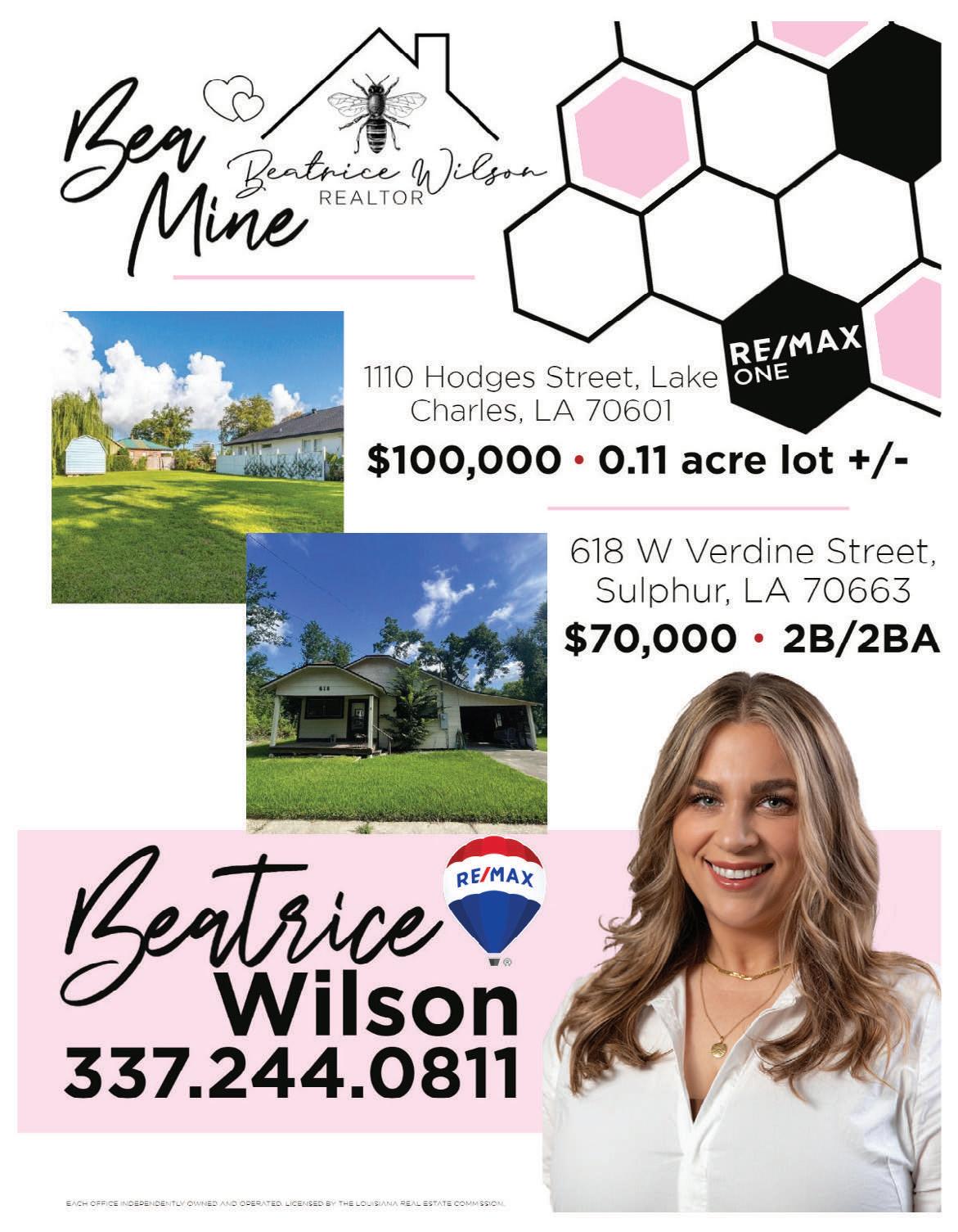 Roger Williams 337-884-8397 rwilliams@inglesafari.com Audrey Brown 337-540-2078 abrown@inglesafari.com 7787 CROCHET ROAD 3 BR 2 BA / 2,435 SQ FT HOME IS ON 6 ACRES WITH A STOCKED POND $238,630/SWL22008292 HAYES SULPHUR 2778 BALFOUR ST 3 BR 2 BA 1,575 SQ FT $165,000 SWL22008769 View All of Our Listings Online at www.inglesafari.com 765 BAYOU PINES EAST | LAKE CHARLES, LA 70601 | 337-478-1601 | Each office is independently owned and operated. Lauren Dunn 337-912-4000 ldunn@inglesafari.com 632 MAPLE STREET 0.72 ACRES / $149,900 SWL22008597 400 PATCH ST 2 BR 1 BA 1,066(E) SQ FT $159,500 SWL22009182 15 FEBRUARY 2023 HFGUIDE.COM
