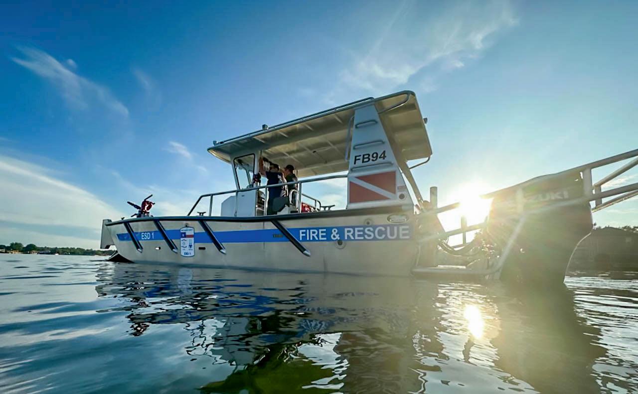 The station’s new 37-foot Munson is equipped with dive gear, fast boards (floating backboards) and a pump that allows lake water to be sprayed at 550 gallons per minute, reaching a distance of about 50 yards from the boat. It replaced a 32-foot Boston Whaler, which is now undergoing repairs. When completed, the Boston Whaler will become a backup to the Munson. “Our goal is to have both boats in the water during busy weekends on the lake,” Oliphant says. Emergencies on land and water